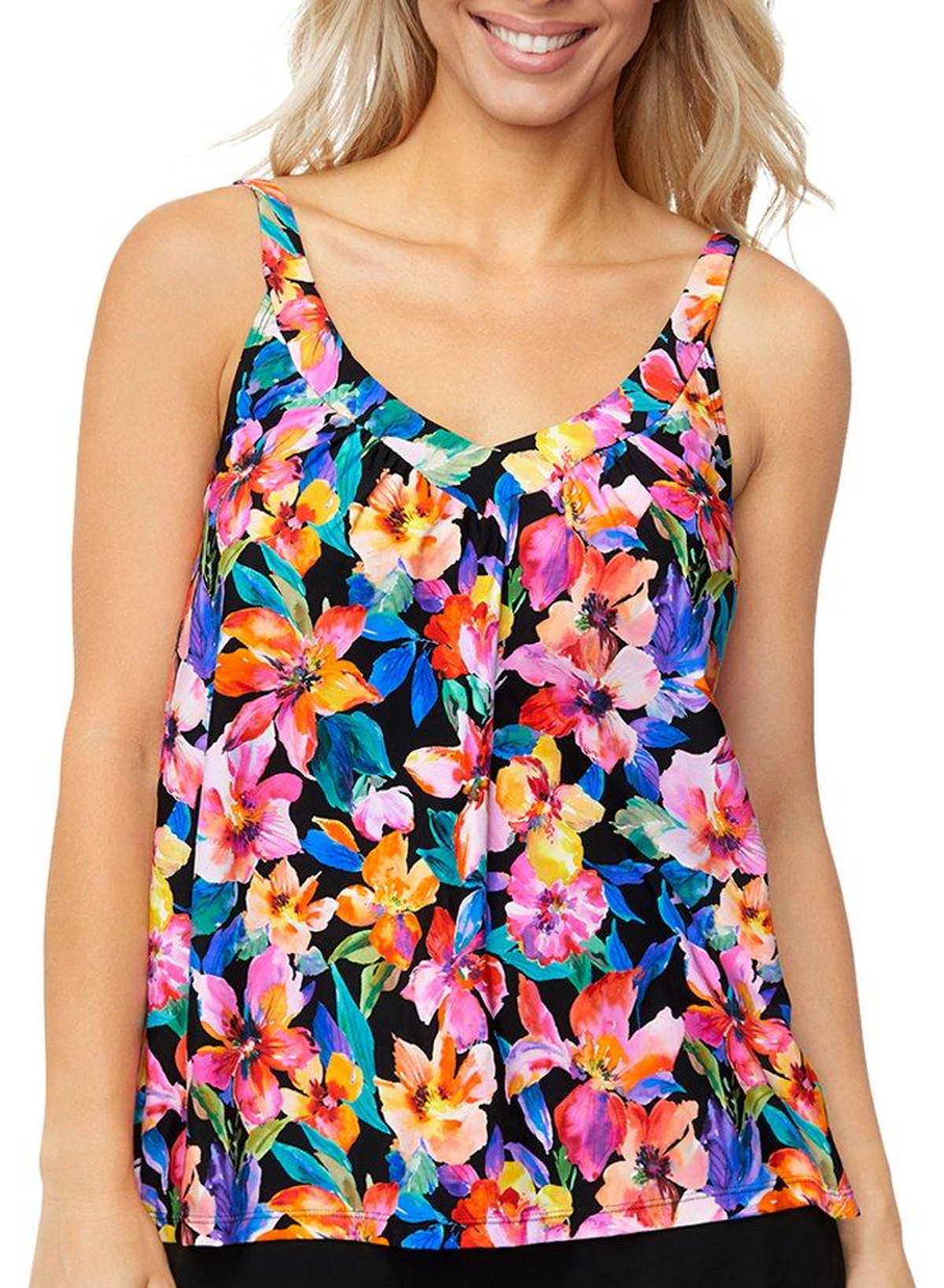 Inspired by the beaches of Hawaii, this tankini top features a tropical print that’s perfect for those who want to make a splash in and out of the water. Additional features include removeable cups and underwire. Fabrication is 88% nylon and 12% spandex.
