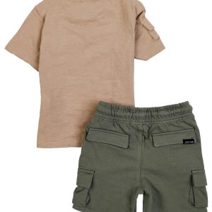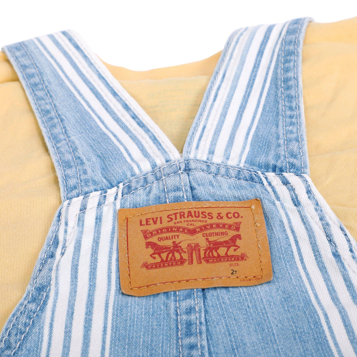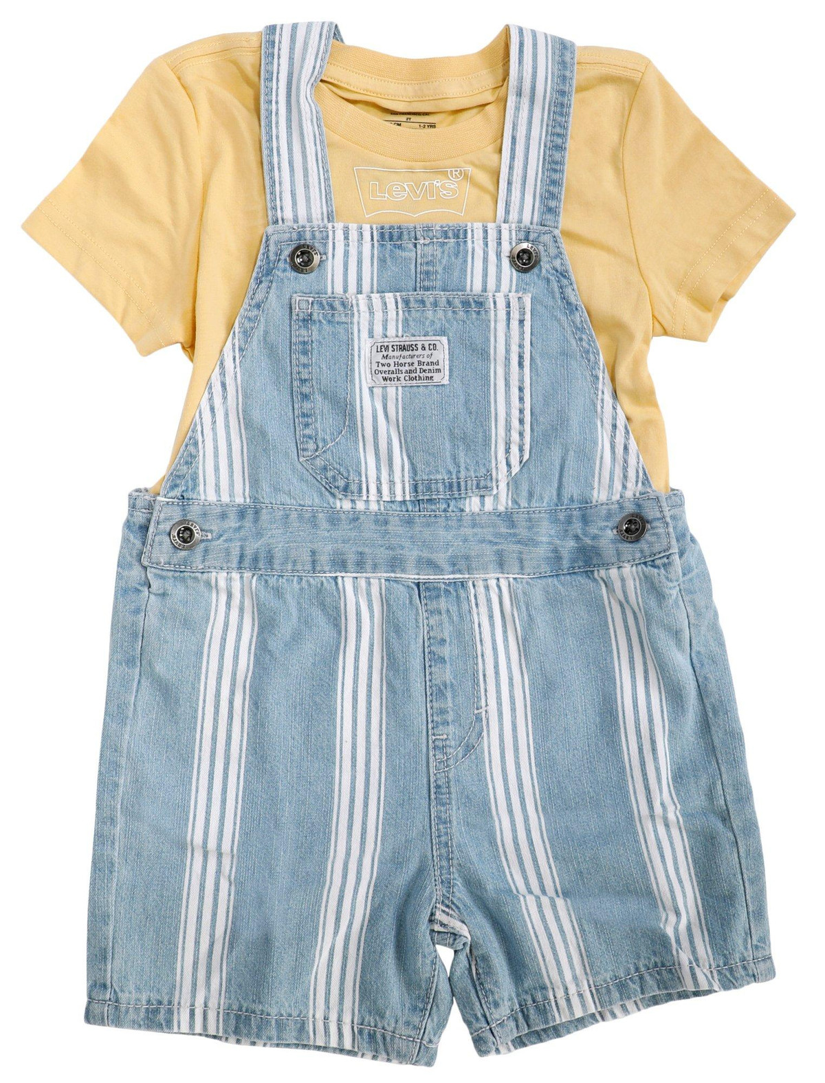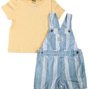 This toddler boys two piece striped indigo shortall set includes classic striped shortalls paired with a soft t shirt for all day comfort. The coordinated look is perfect for playdates or outings offering easy style and charm in one simple outfit. Fabrication 60% cotton and 40% polyester