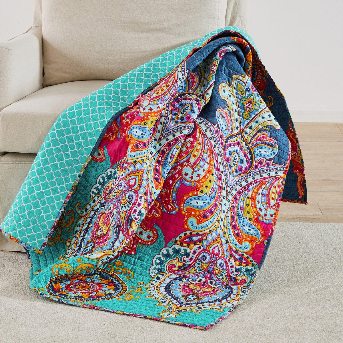 The Fantasia Reversible Quilted Throw by Levtex Home is inspired by the vibrant patterns and colors of exotic bazaars. This exuberant mix of pattern and color design will immediately transform your bedroom. Made with the softest lightweight cotton, this reversible throw features a swirl of damasks and medallions in playful colors, reversing to a teal and white trellis on the back. The Quilted Throw is perfectly sized at 50x60in. and is machine washable. Enjoy this for years to come!