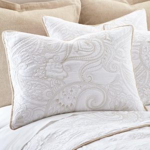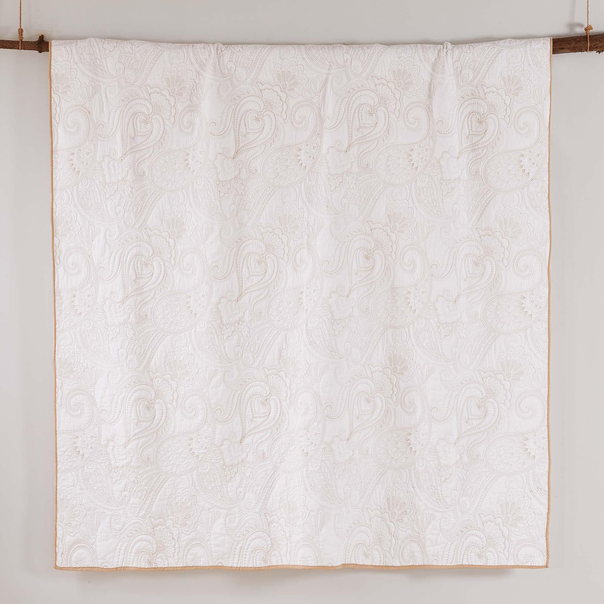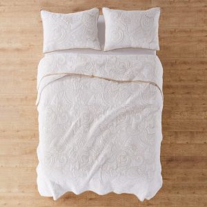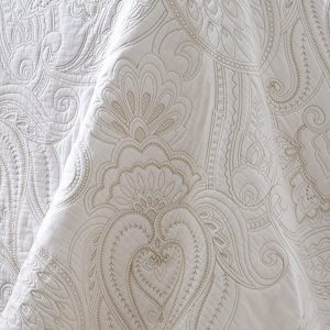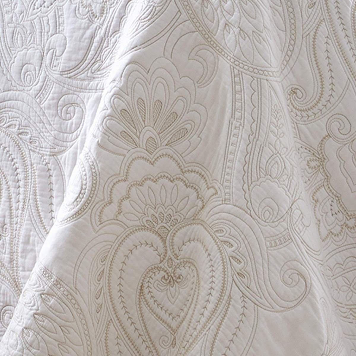 Transform your bedroom with the Perla Quilt and Sham Set by Levtex Home. Inspired by timeless paisley scarves, this elegant set features intricate taupe embroidery on soft, lightweight white cotton. The reversible design adds versatility, while its breathable fabric ensures year-round comfort. Machine washable for easy care, this chic and classic set brings lasting beauty, comfort, and sophistication to your space.