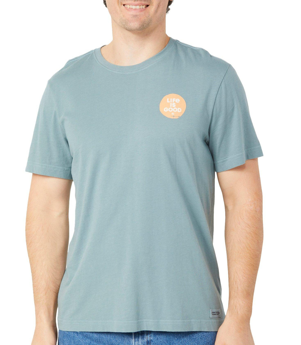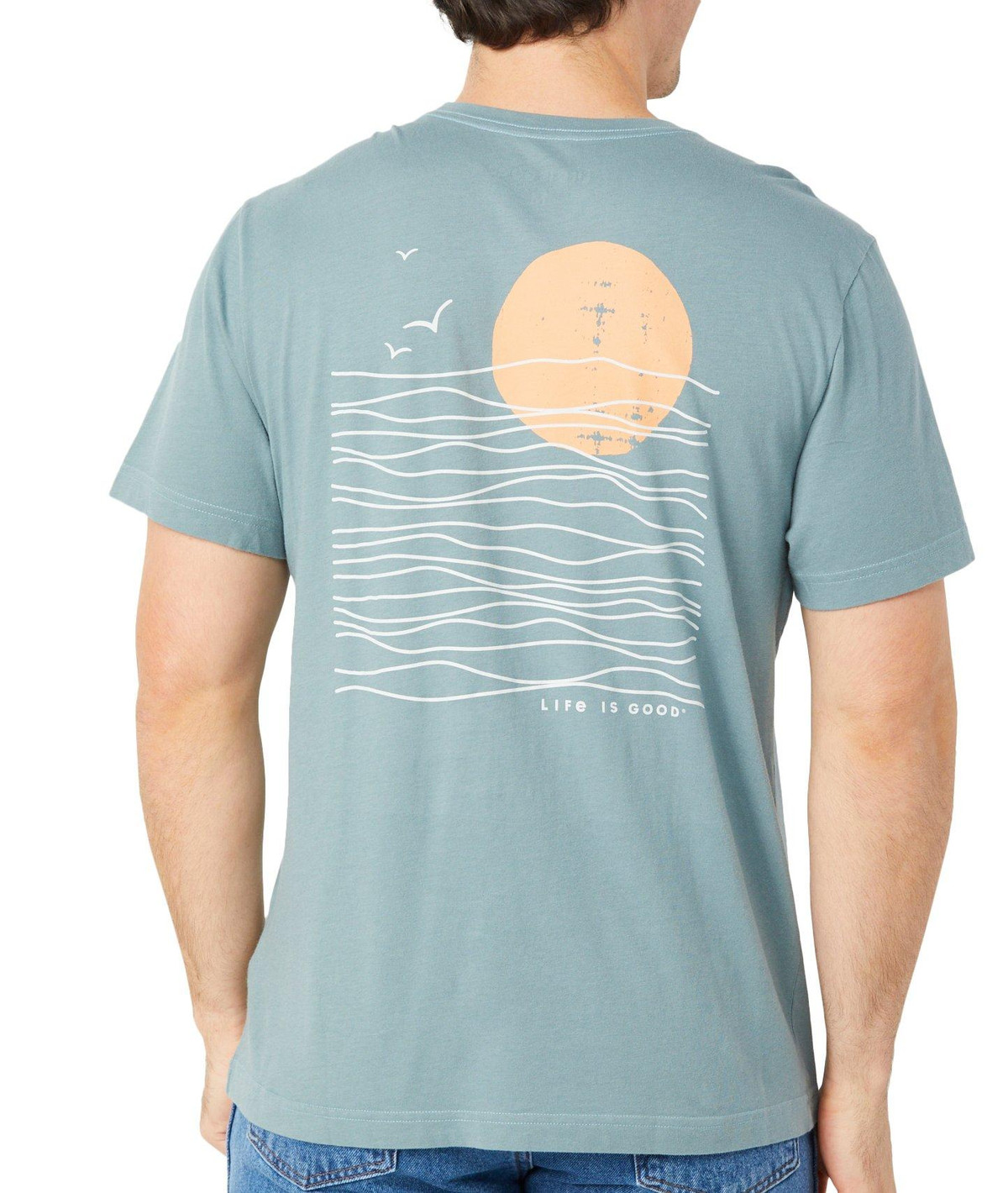 This mens tee features a soft cotton build with a bold sunset graphic on the back. Designed for casual comfort and laid back style with a touch of visual flair. Fabrication is 100% cotton.