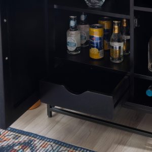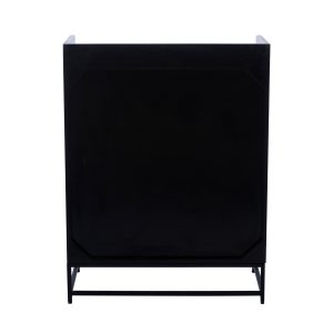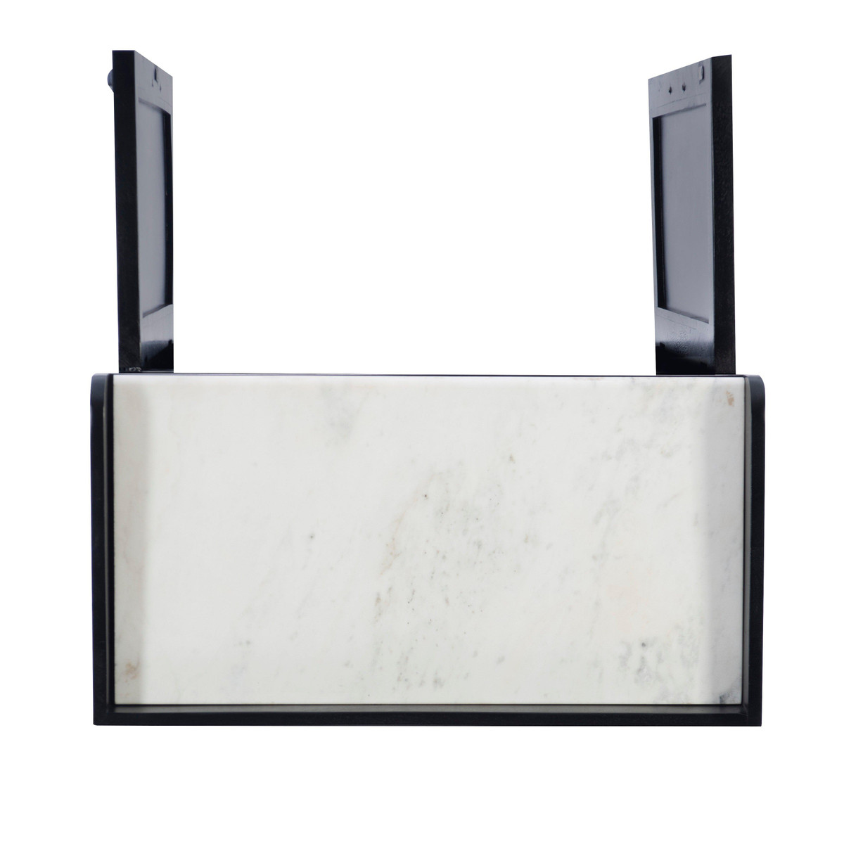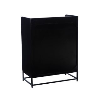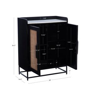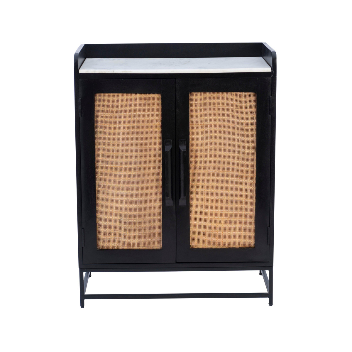 The Janie Rattan Bar Cabinet boasts a classic midcentury aesthetic for the quintessential home bar centerpiece. It features 4 shelves, 6 hanging racks for wine glasses, 3 cubbies for storing bottles and a wooden drawer for corkscrews and utensils. A white marble top is surrounded by a wooden border, creating a dream working station for casual and expert bartenders alike. The frame is constructed of solid mango wood and supported by an iron. Measures 28 in. W x 14.5 in. D x 36.5 in. H.