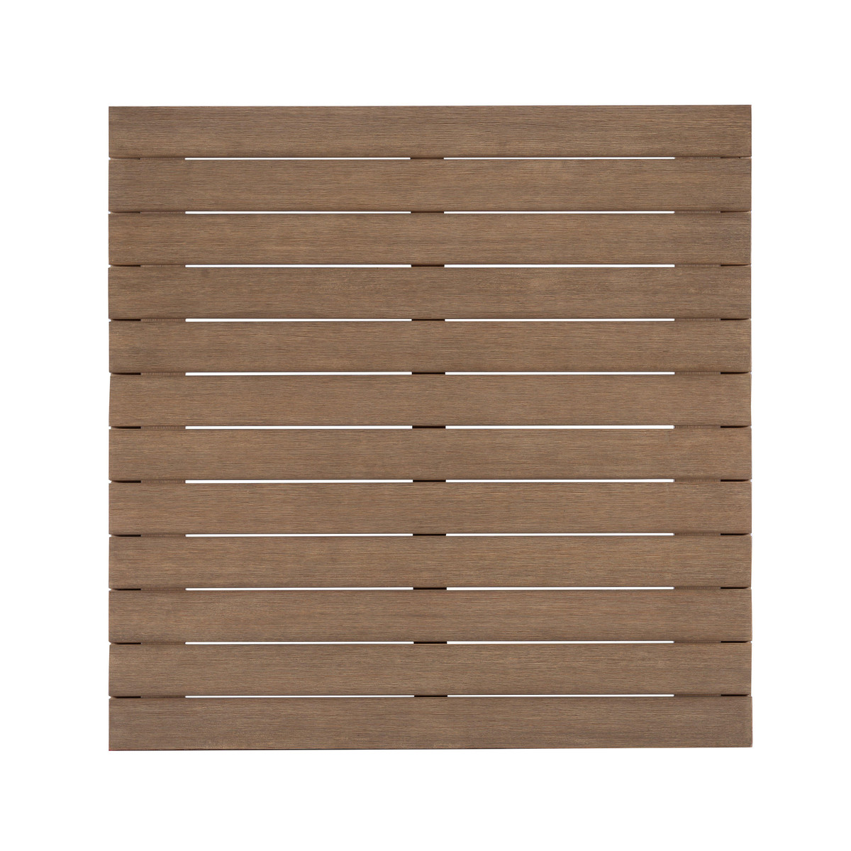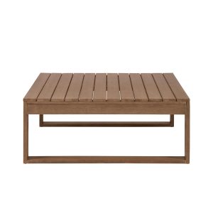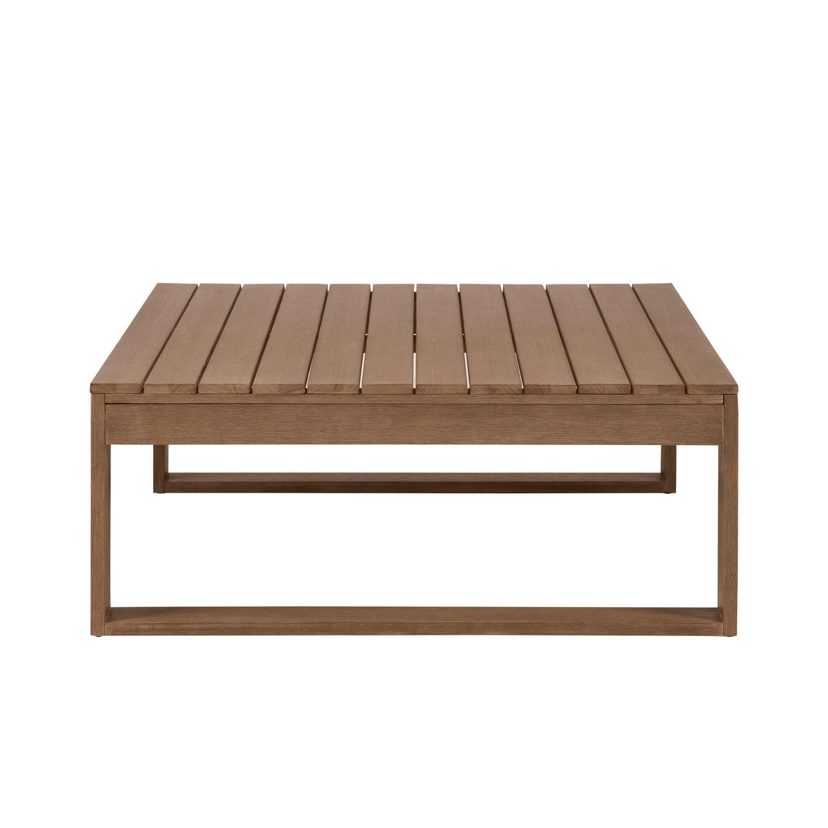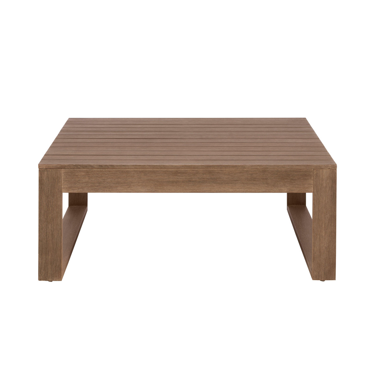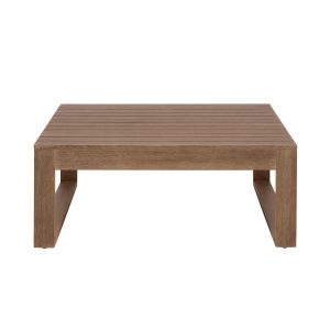 This stately oversized Silas Coffee Table builds a strong foundation for your outdoor gathering space. Made of solid eucalyptus wood for resistance to decay and water damage, the sturdy frame is wire brushed, providing a natural finish highlighting the beautiful wood grain. The slatted top accentuates its rustic character, while the square legs lean into minimal midcentury appeal. Arrives with some assembly required. Measures 37.4W x 37.4D x 14.96H.