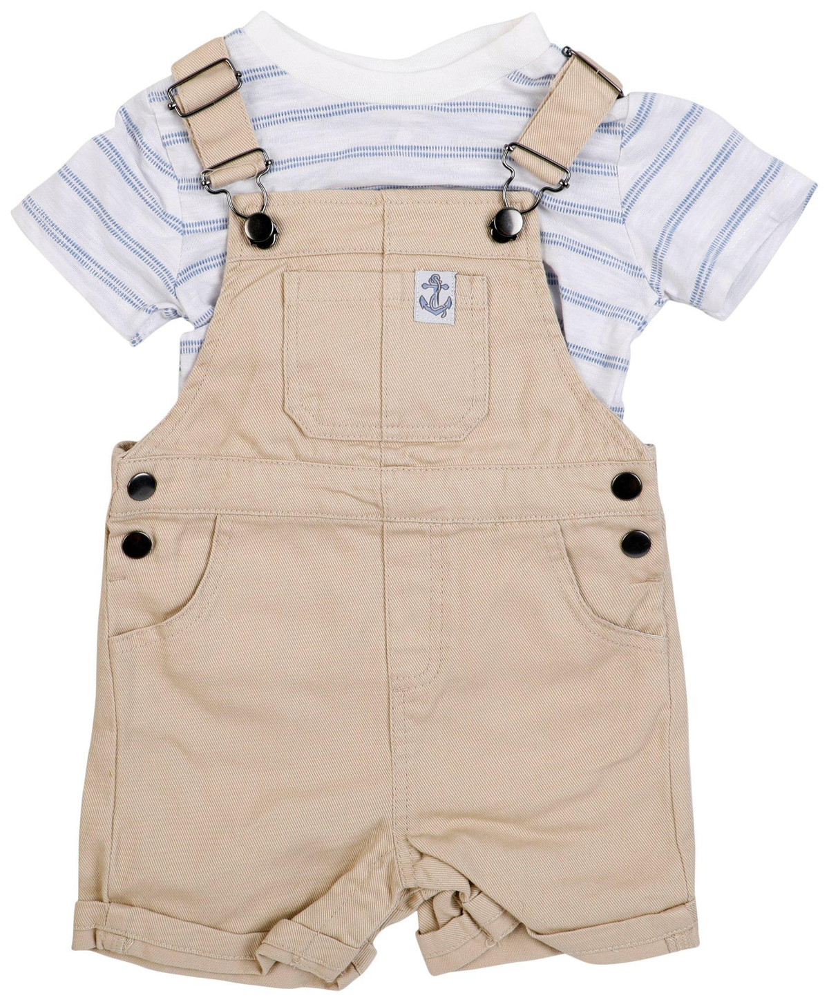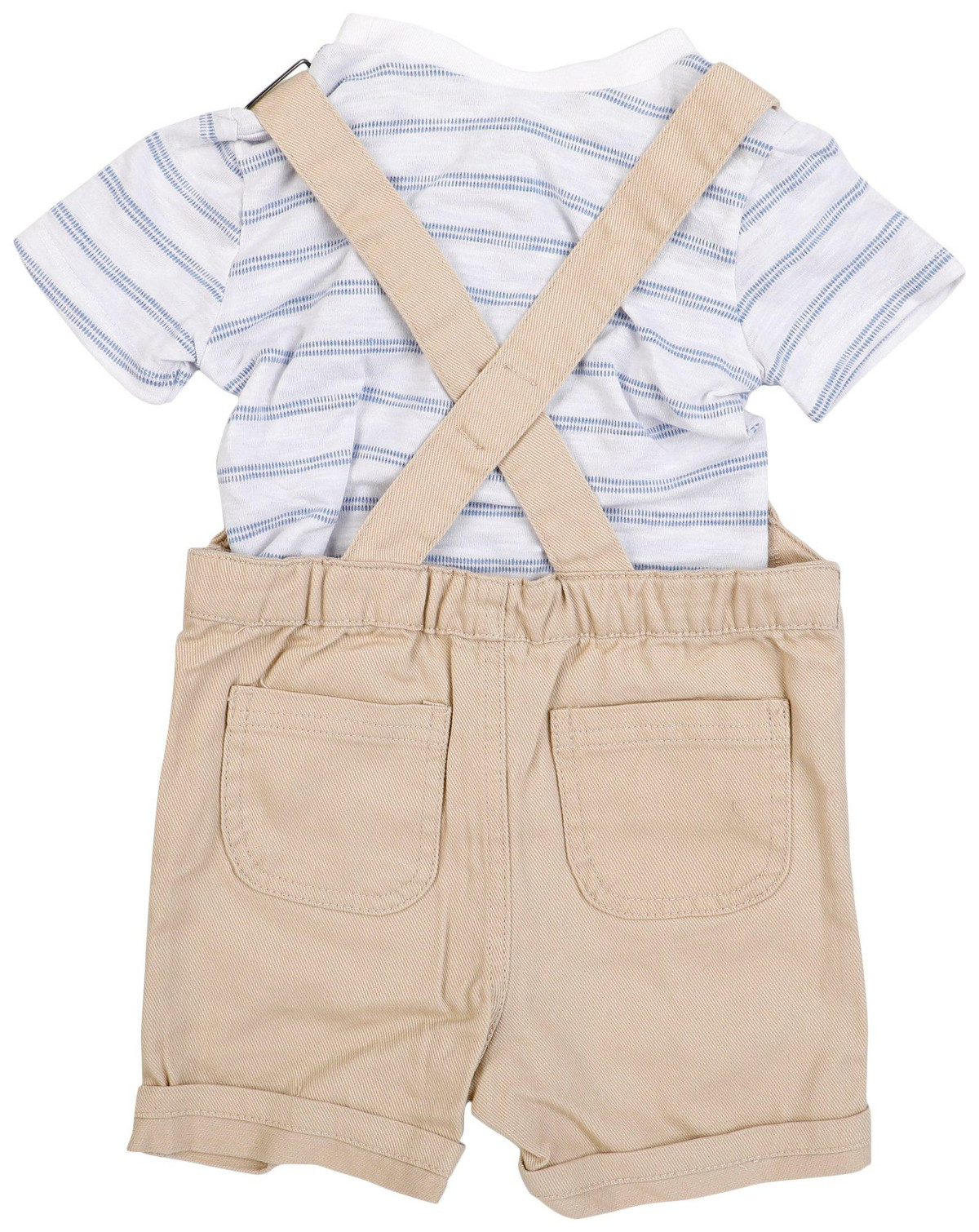 Elevate your casual look with this 2 Piece Set, designed for comfort and style. This set includes a striped tee and woven short overalls. Perfect for active days with the family, this set combines comfort and style. Fabrication is: Shirt 60% cotton, 40% polyester, Overalls 100% cotton.