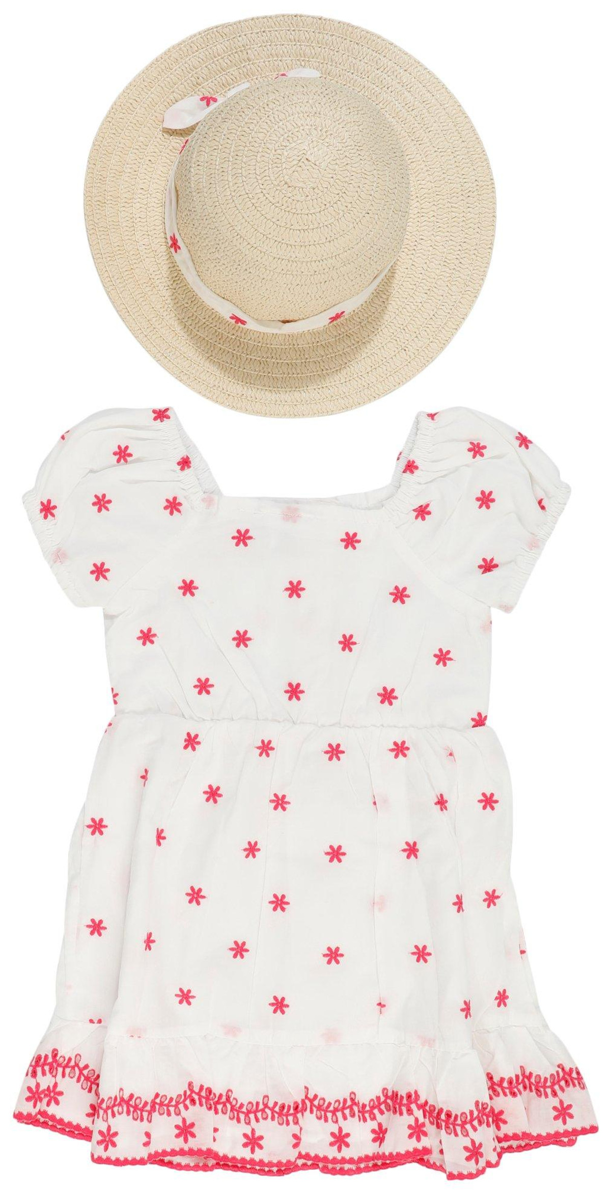 Dress your little one in charming elegance with the Girls 2-Piece Poplin Dress and Hat Set. This delightful ensemble features a beautifully embroidered dress with a faux button front, adding a touch of sophistication. The matching hat completes the look, providing both style and sun protection.