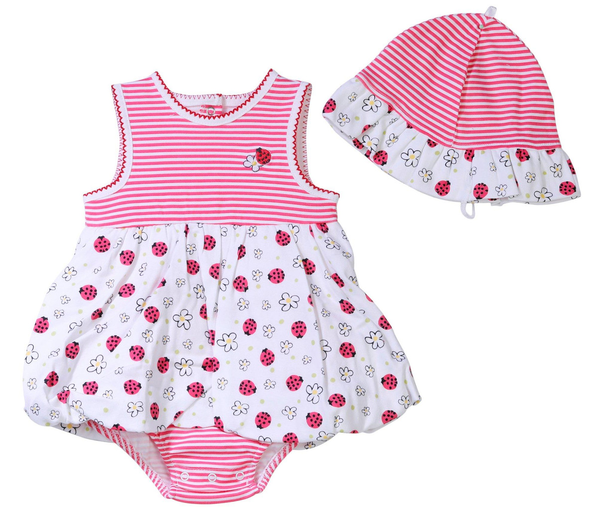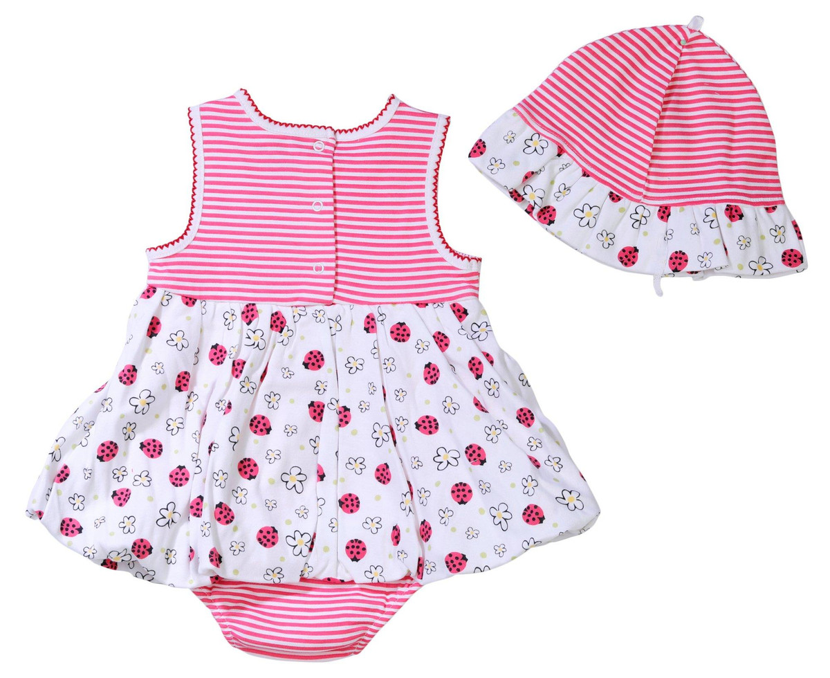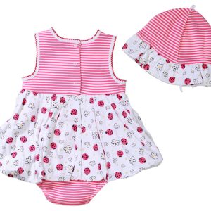 This adorable two-piece infant girls’ dress set from Little Me features a playful ladybug and floral print with a sleeveless design and ruffle trim. Made from soft, breathable cotton, it includes a matching beanie-style hat for a cozy and coordinated look. Perfect for warm-weather outings, this sweet ensemble combines comfort and charm for your little love bug.