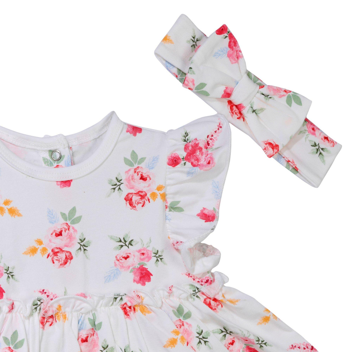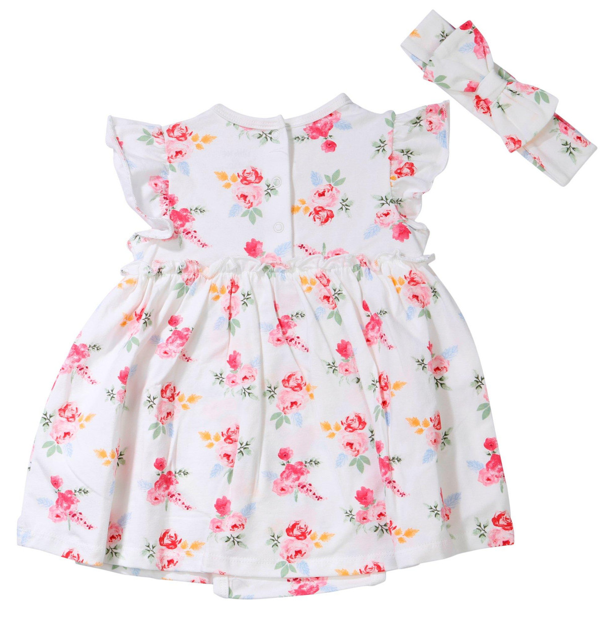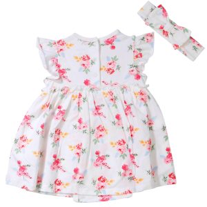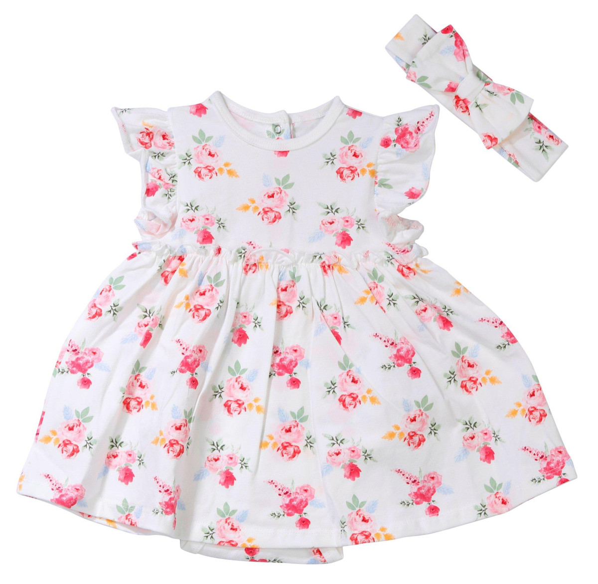 This adorable two-piece infant girls’ dress set from Little Me features a delicate floral print and sleeveless design with charming ruffle trim. Made from soft, breathable cotton, it includes a matching diaper cover and a coordinating bow headband to complete the look. Perfect for warm-weather outings, family gatherings, or sweet photo moments.
