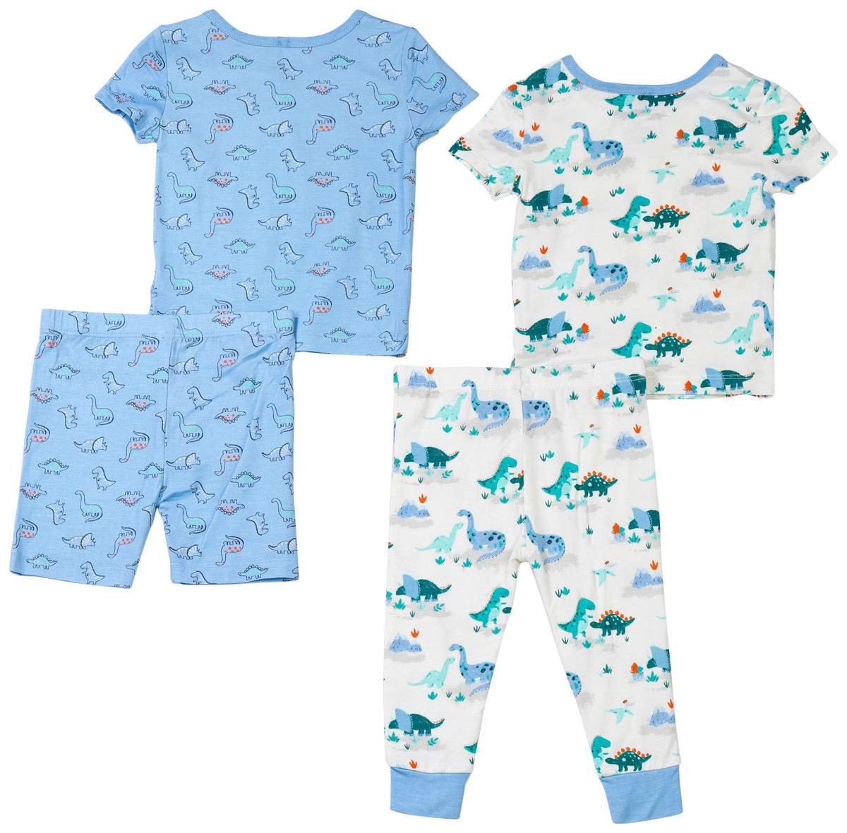 Wrap him in comfort and charm with the Baby Boys 4 Piece Dinosaur Pajama Set. Featuring two coordinated outfits with playful dinosaur prints, the set includes one short-sleeve top with shorts and another with long pants for versatile sleepwear options. Crafted from soft fabric for restful nights and easy layering. Machine wash cold for hassle-free care.