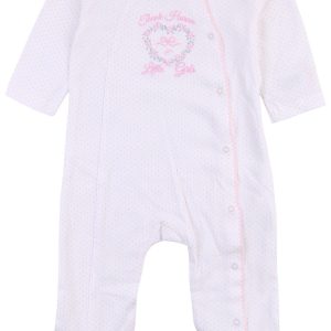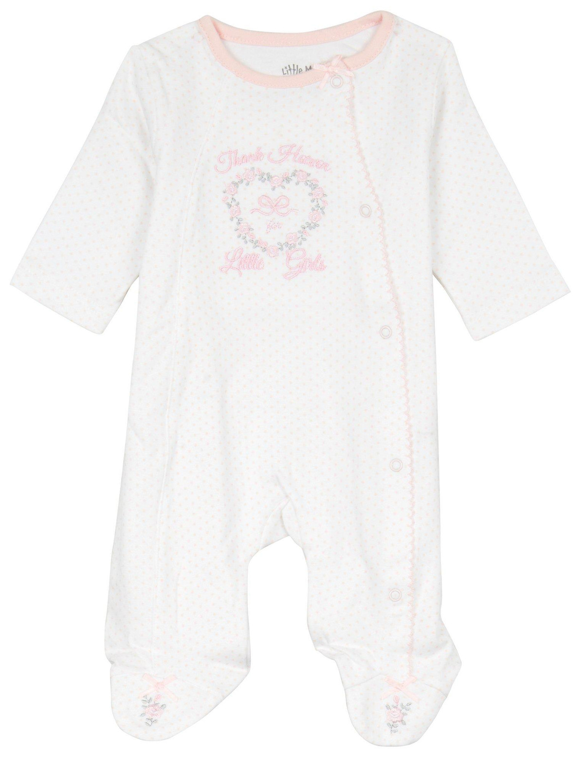 This footed sleeper from Little Me is a cute and cozy piece for your baby girl! It features a stylish polka dot print, a full front snap button closure and an embroidered Thank Heaven For Little Girls quote. Fabrication is 100% cotton.