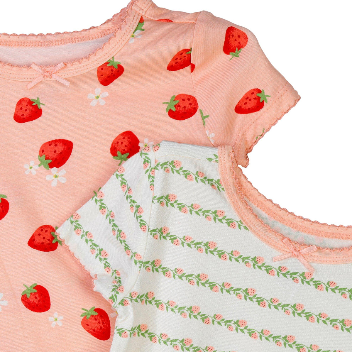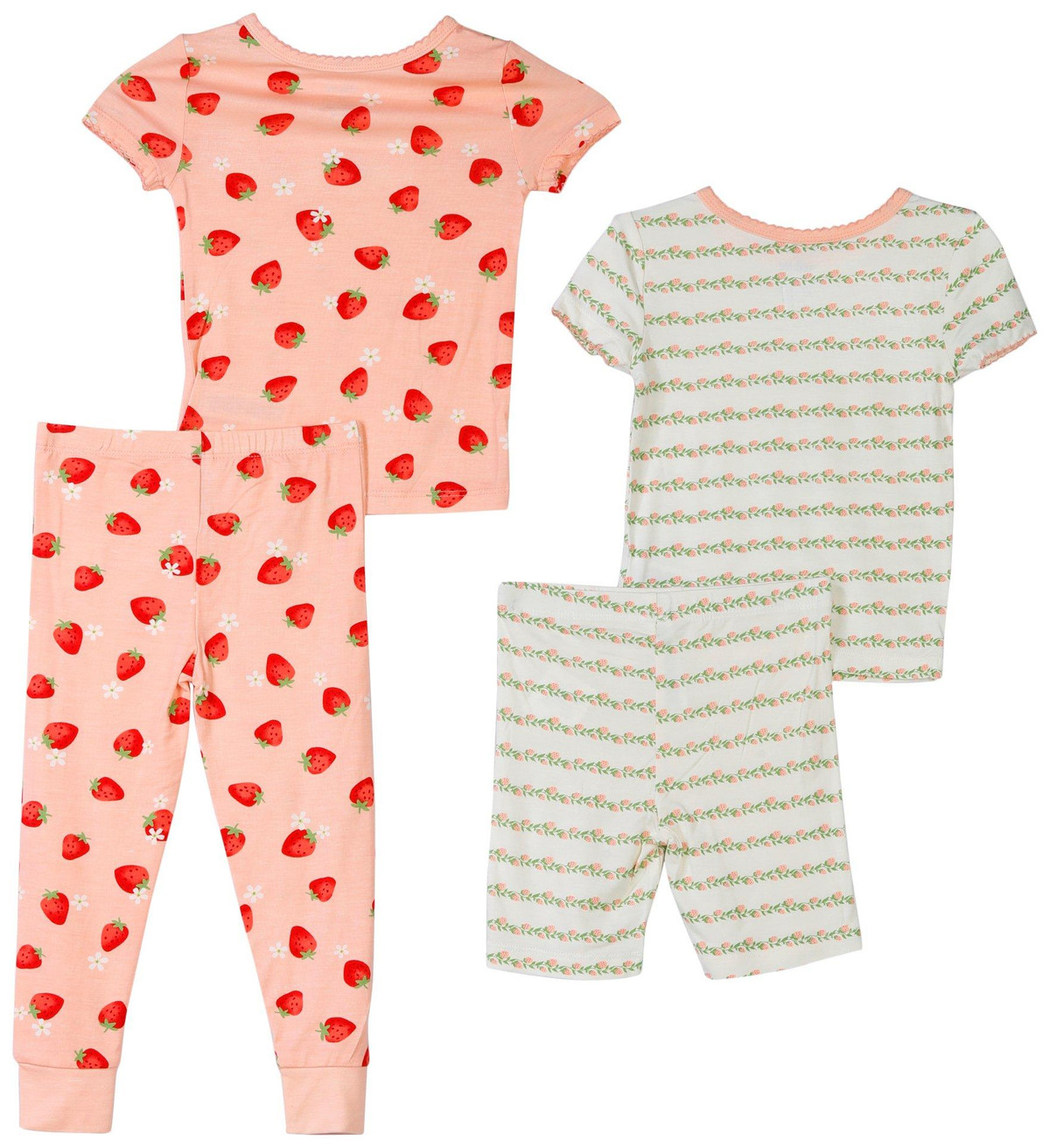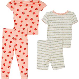 Dress her in cozy comfort with the Toddler Girls 4Pc Strawberry Stripes Pajama Set. Featuring one floral striped set with coordinating shortsleeve shirt and shorts, plus one strawberry print set with shortsleeve shirt and matching pants, this collection blends playful design with soft fabric for restful sleep. Designed for easy layering and overnight comfort. Machine wash cold for easy care.
