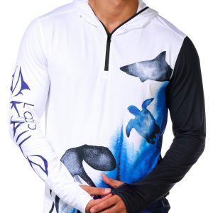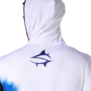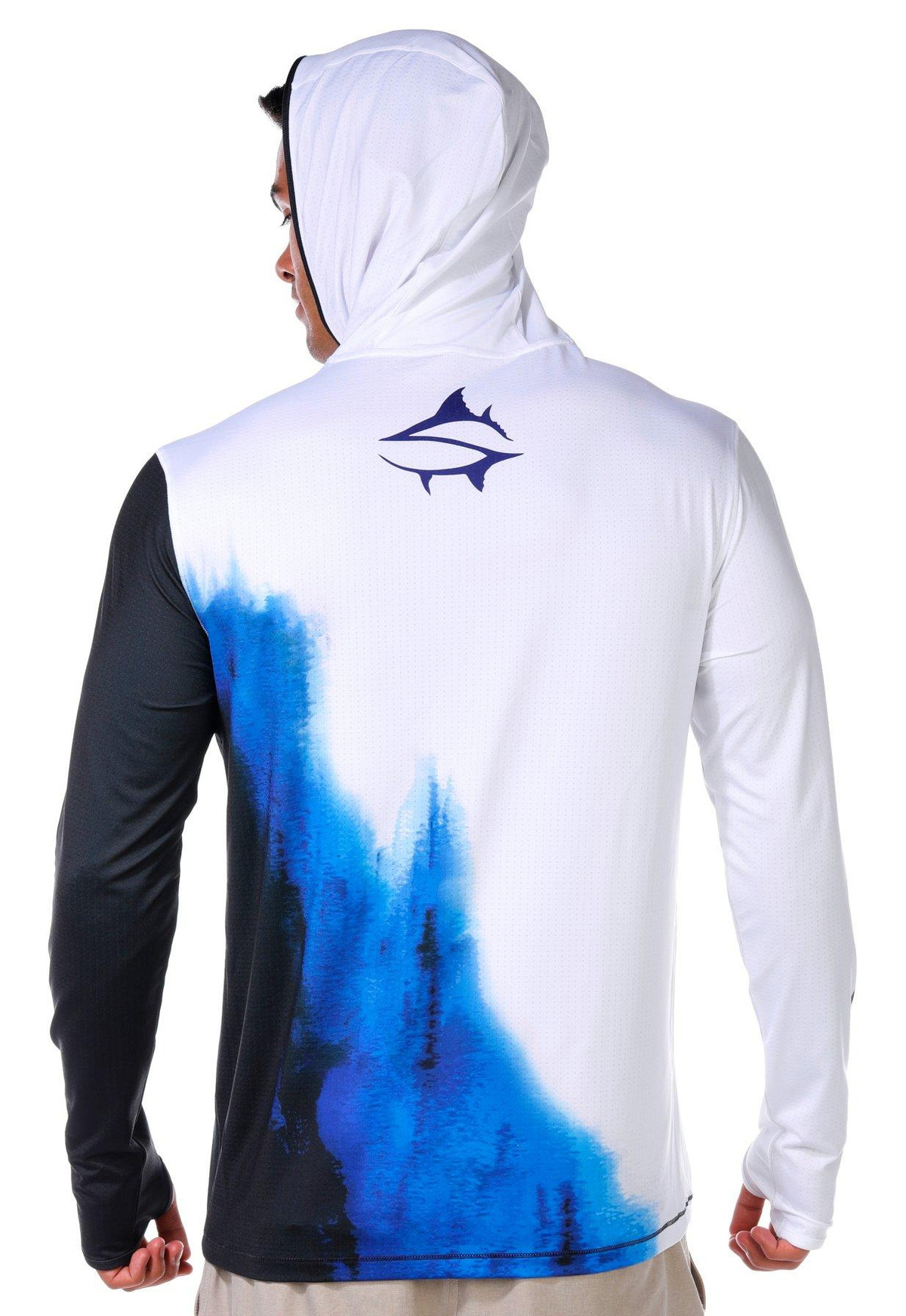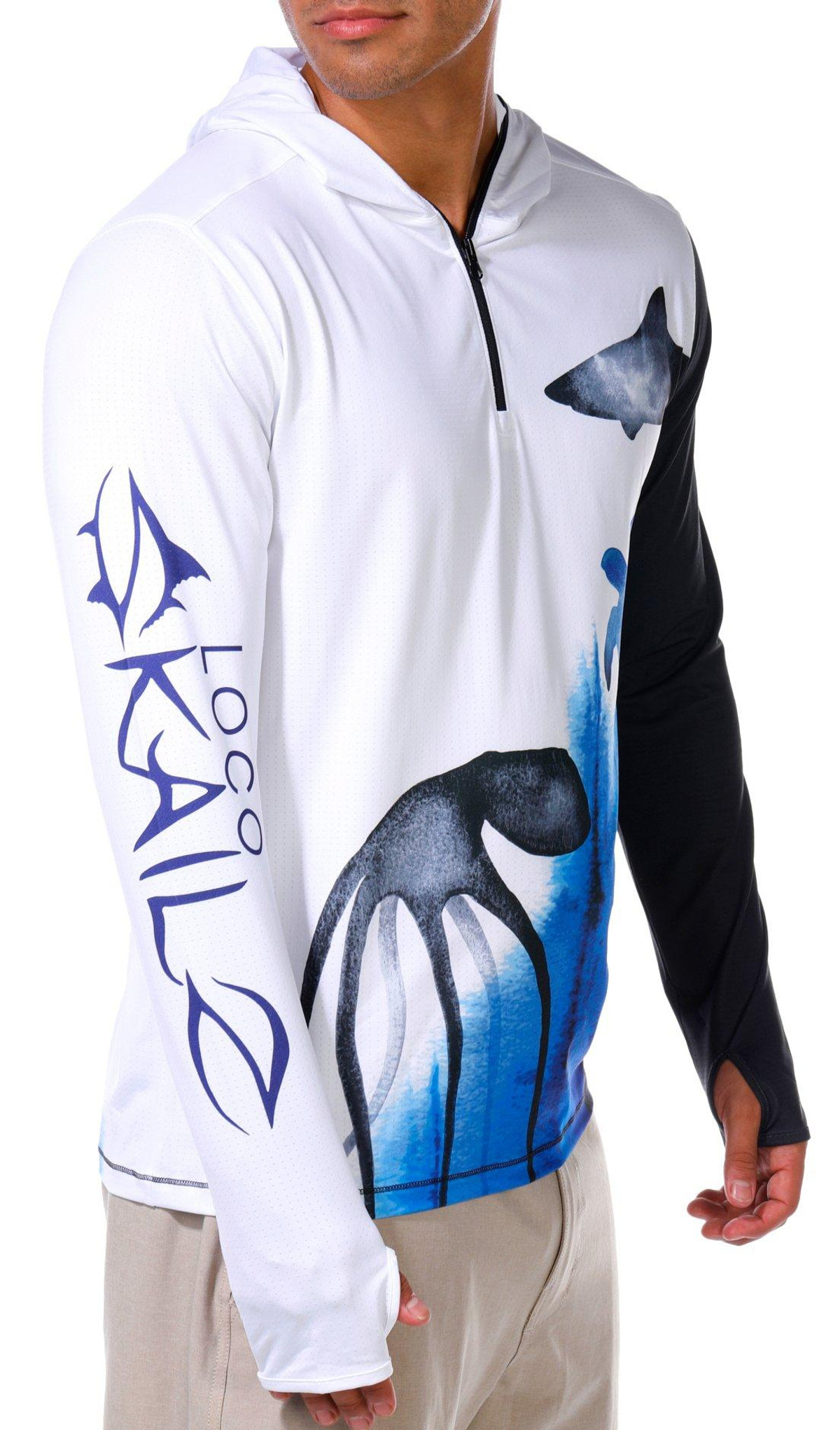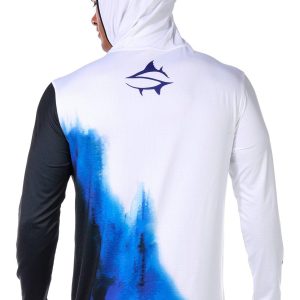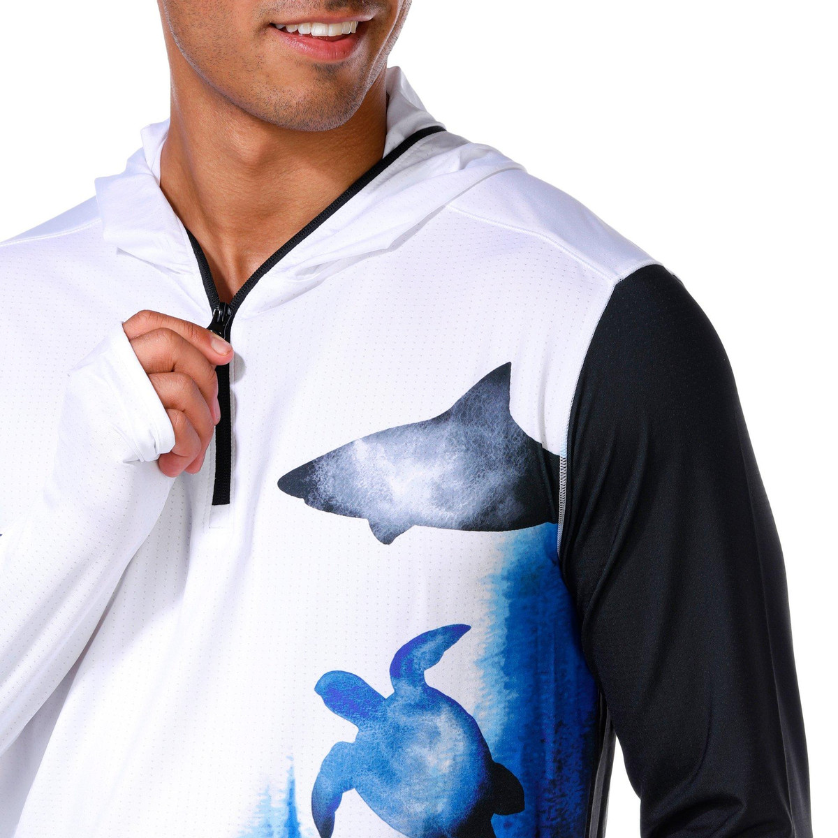 This mens tournament performance hooded shirt offers UPF 50 plus protection with long sleeves featuring thumbholes for added coverage. The quarter zip neckline and performance stretch fabric provide comfort and mobility while moisture wicking technology keeps you dry during active days outdoors. Fabrication 92% polyester, 8% spandex.