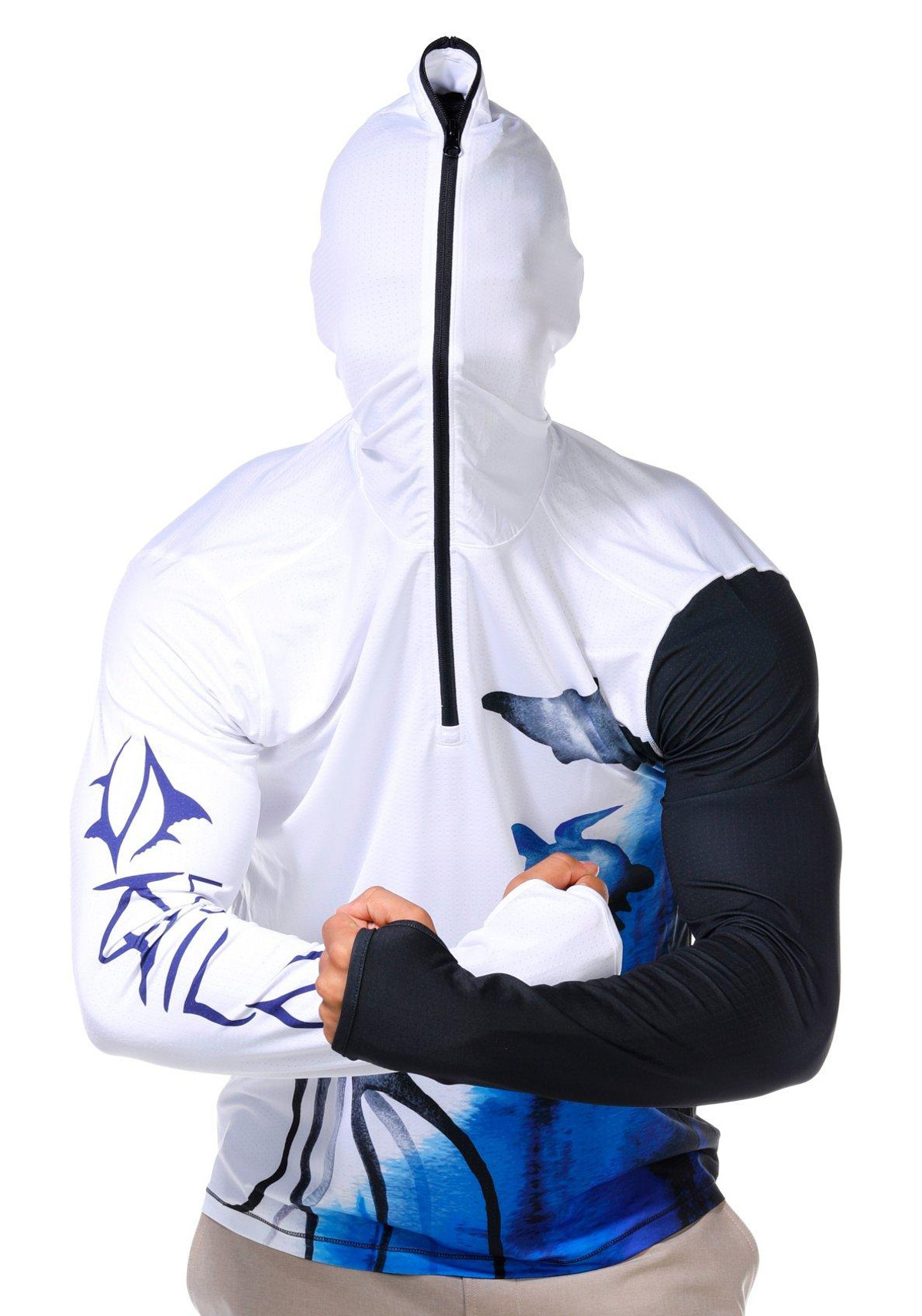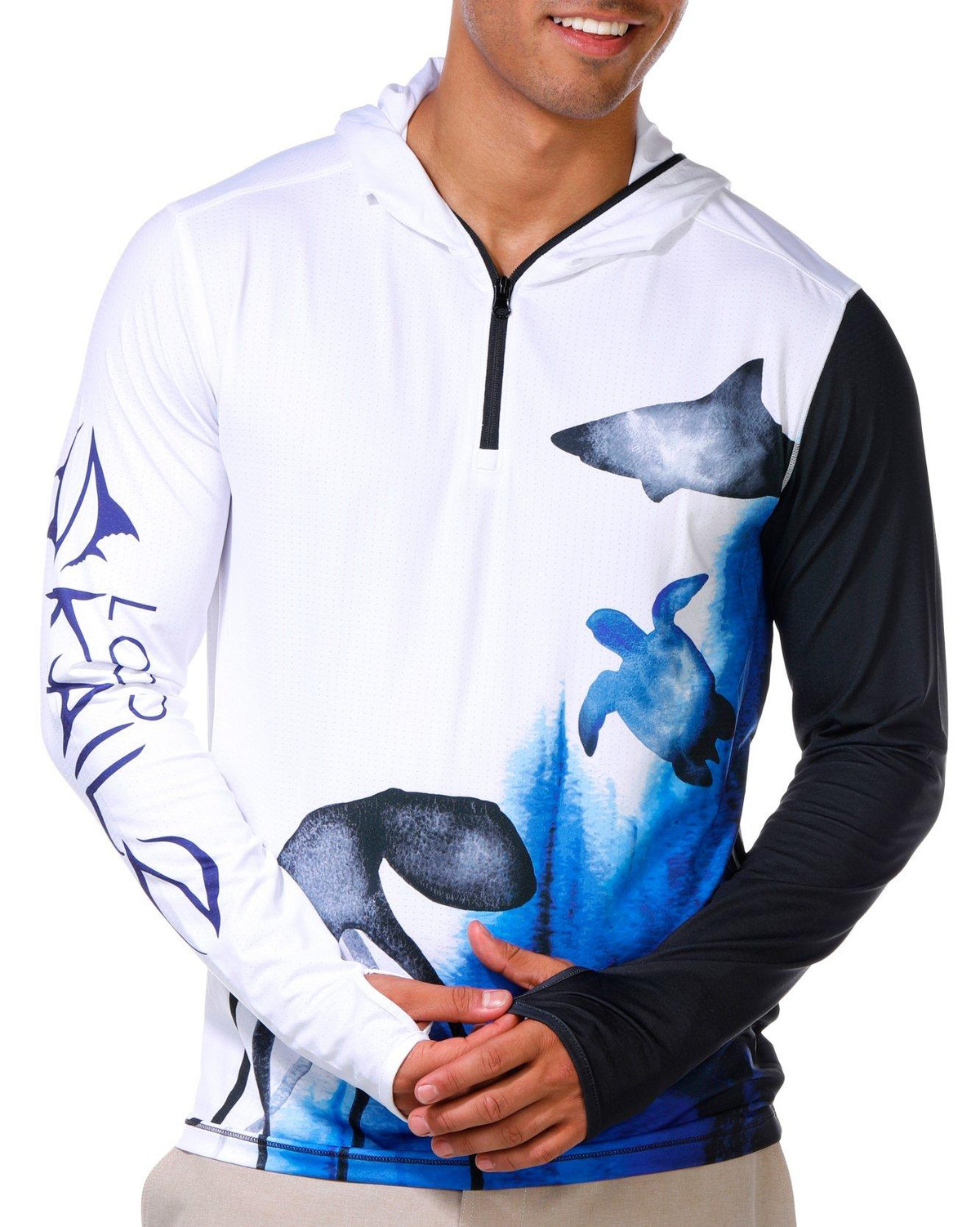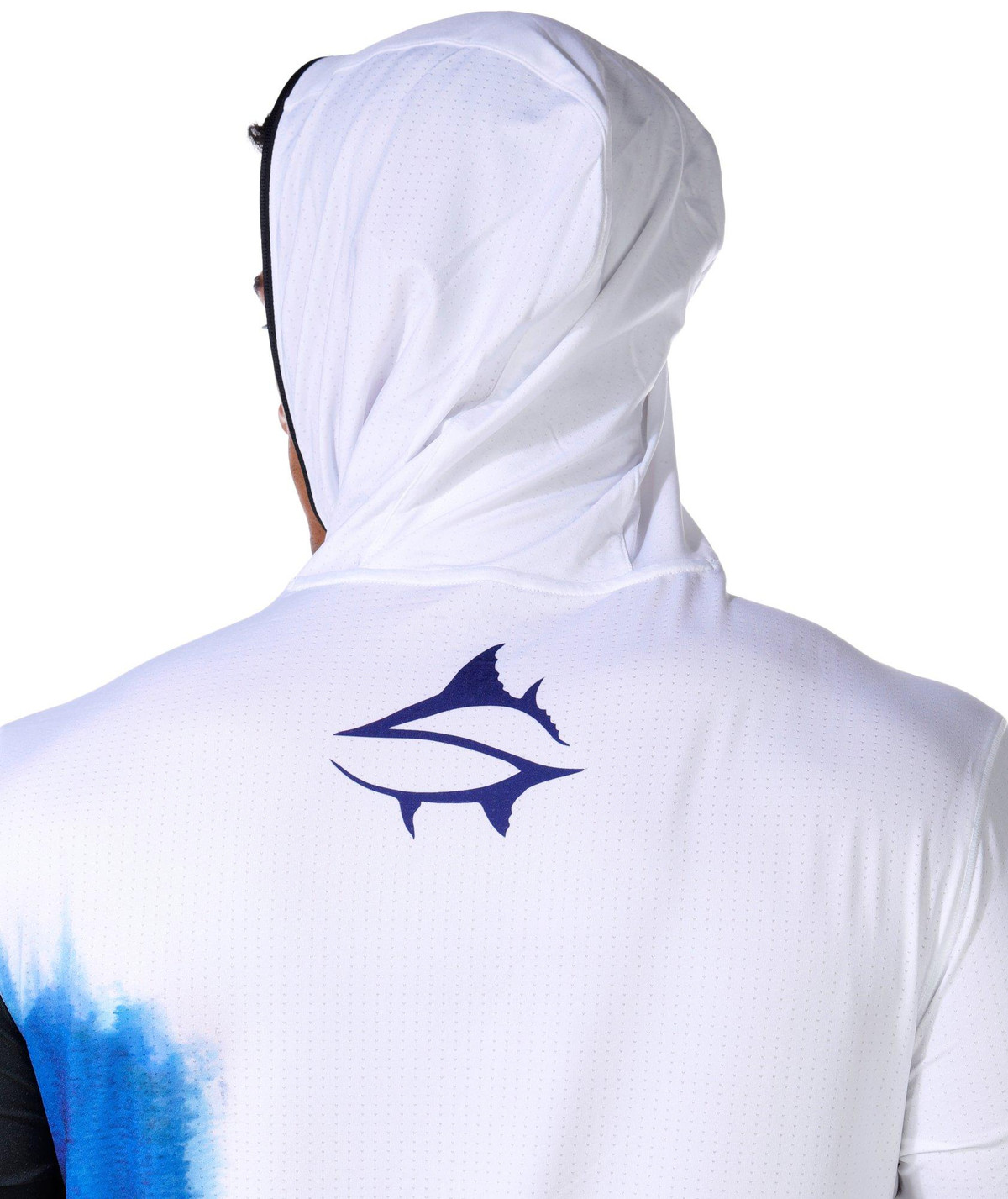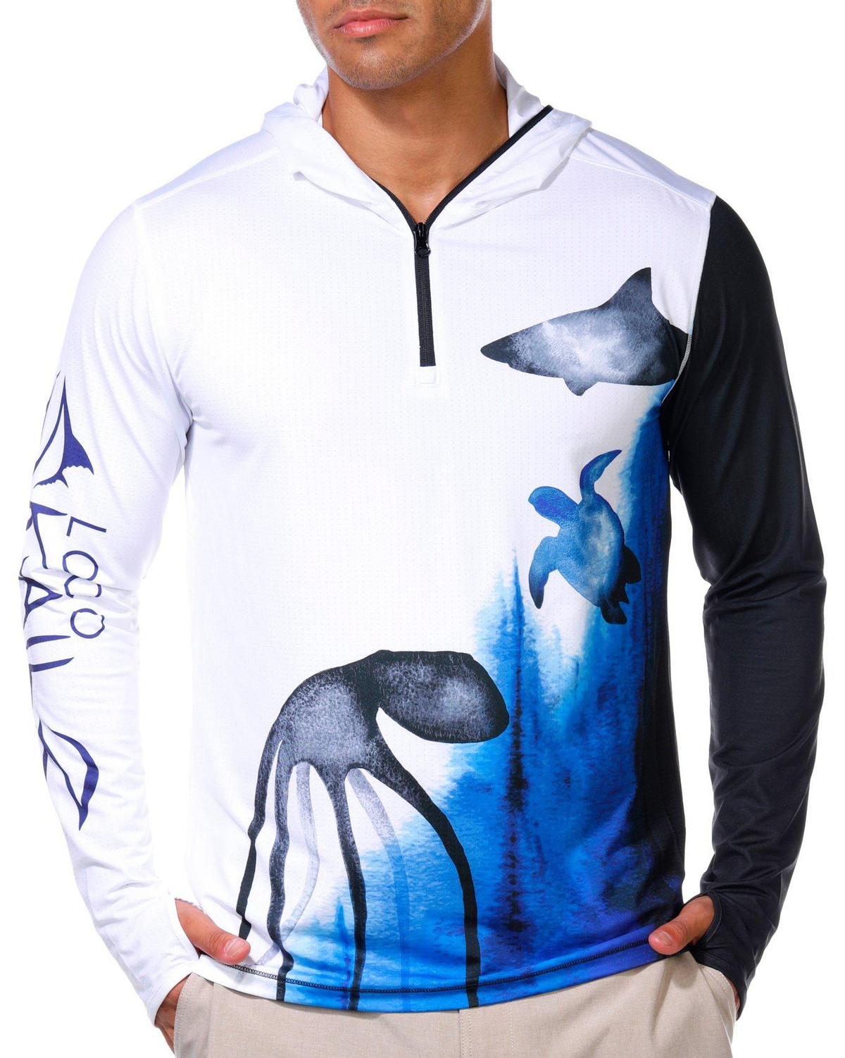 This mens tournament performance hooded shirt offers UPF 50 plus protection with long sleeves featuring thumbholes for added coverage. The quarter zip neckline and performance stretch fabric provide comfort and mobility while moisture wicking technology keeps you dry during active days outdoors. Fabrication 92% polyester, 8% spandex.