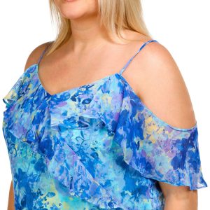 Introducing the Plus Cold Shoulder Midi Dress, crafted from 100% polyester for a comfortable and elegant fit. This stylish dress features a chic print, a cold shoulder design, and a ruffle tier skirt that adds a touch of sophistication. The back zip ensures easy wear, while the 48-inch midi length makes it perfect for various occasions, from casual outings to special events.
