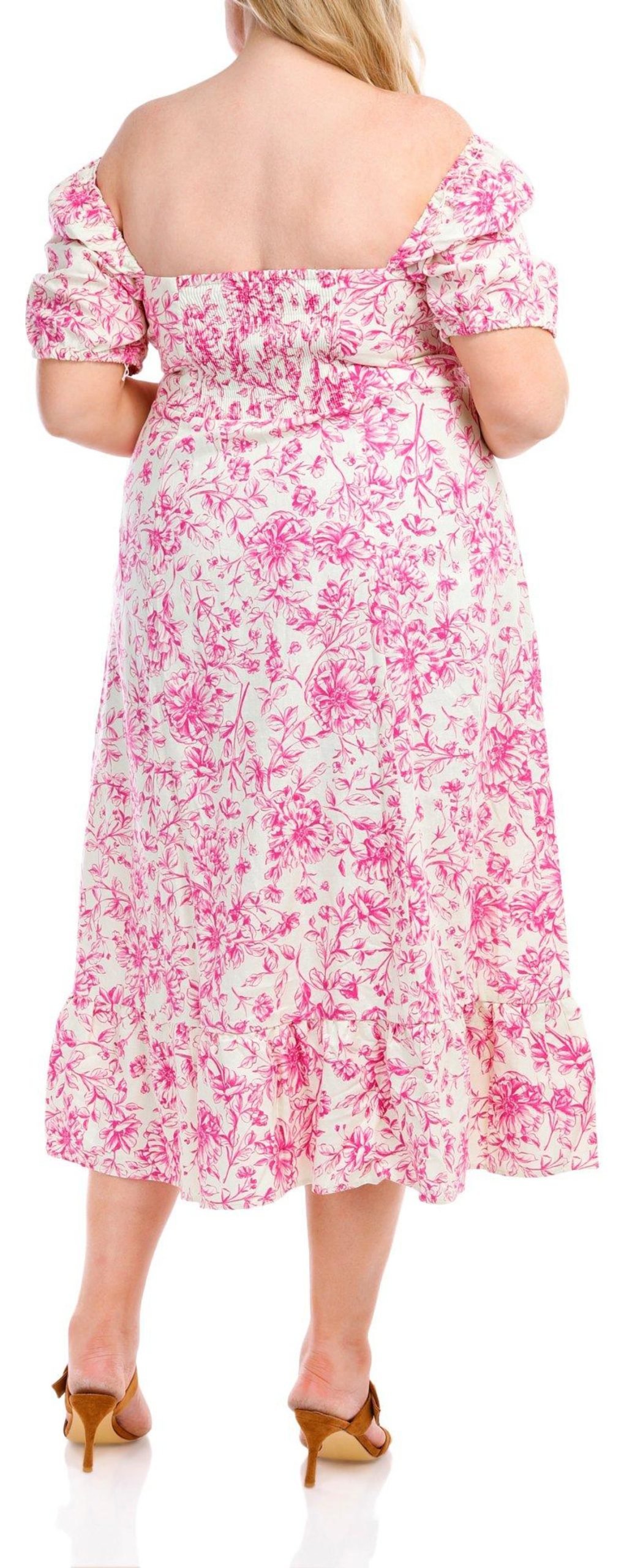 Introducing the Plus Short Sleeve Floral Midi Dress, a perfect blend of elegance and comfort. Made from a mix of linen and rayon, this dress features a stylish floral design that adds a touch of charm. The short puffer sleeves and square neckline offer a flattering and modern look, while the side slit and ruffle hem provide a playful and feminine touch. Ideal for both casual and semi-formal occasions, this dress is a versatile addition to any wardrobe.