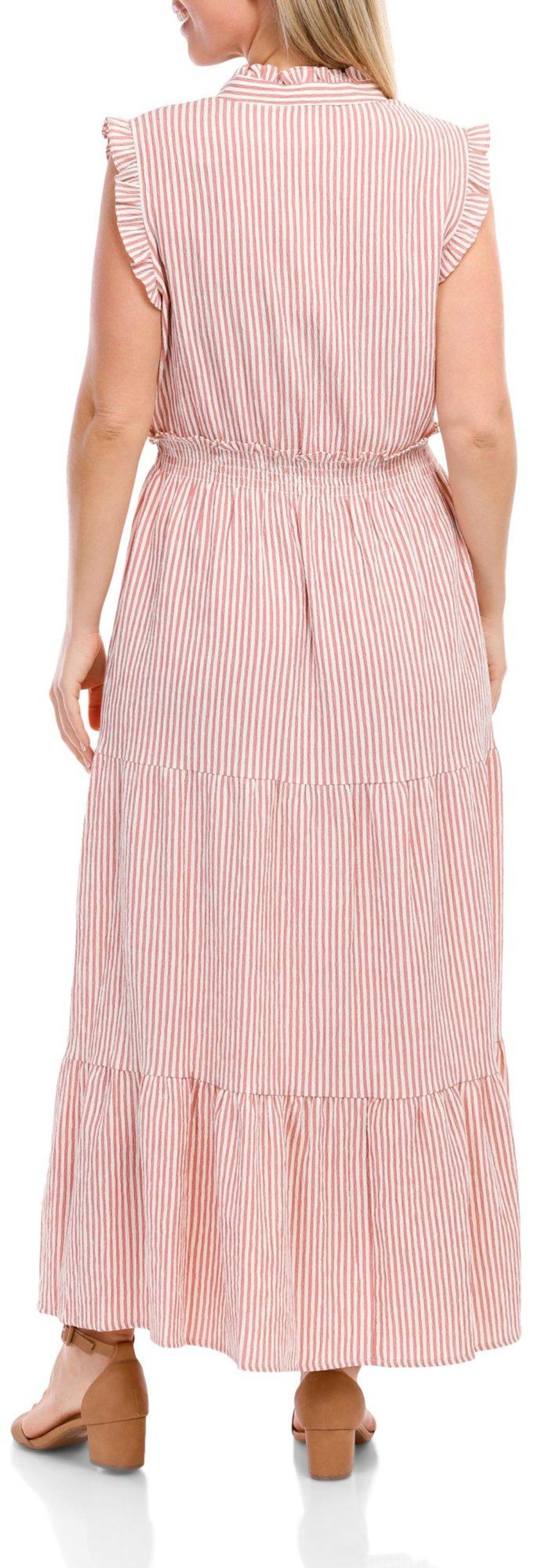 Introducing the Sleeveless Maxi Dress, a perfect blend of elegance and comfort. This dress features a stylish striped pattern that adds a touch of sophistication. The ruffled and smocked details provide a unique texture and flattering fit, making it ideal for any occasion. Fabrication is 80% polyester, 18% rayon, 2% spandex.