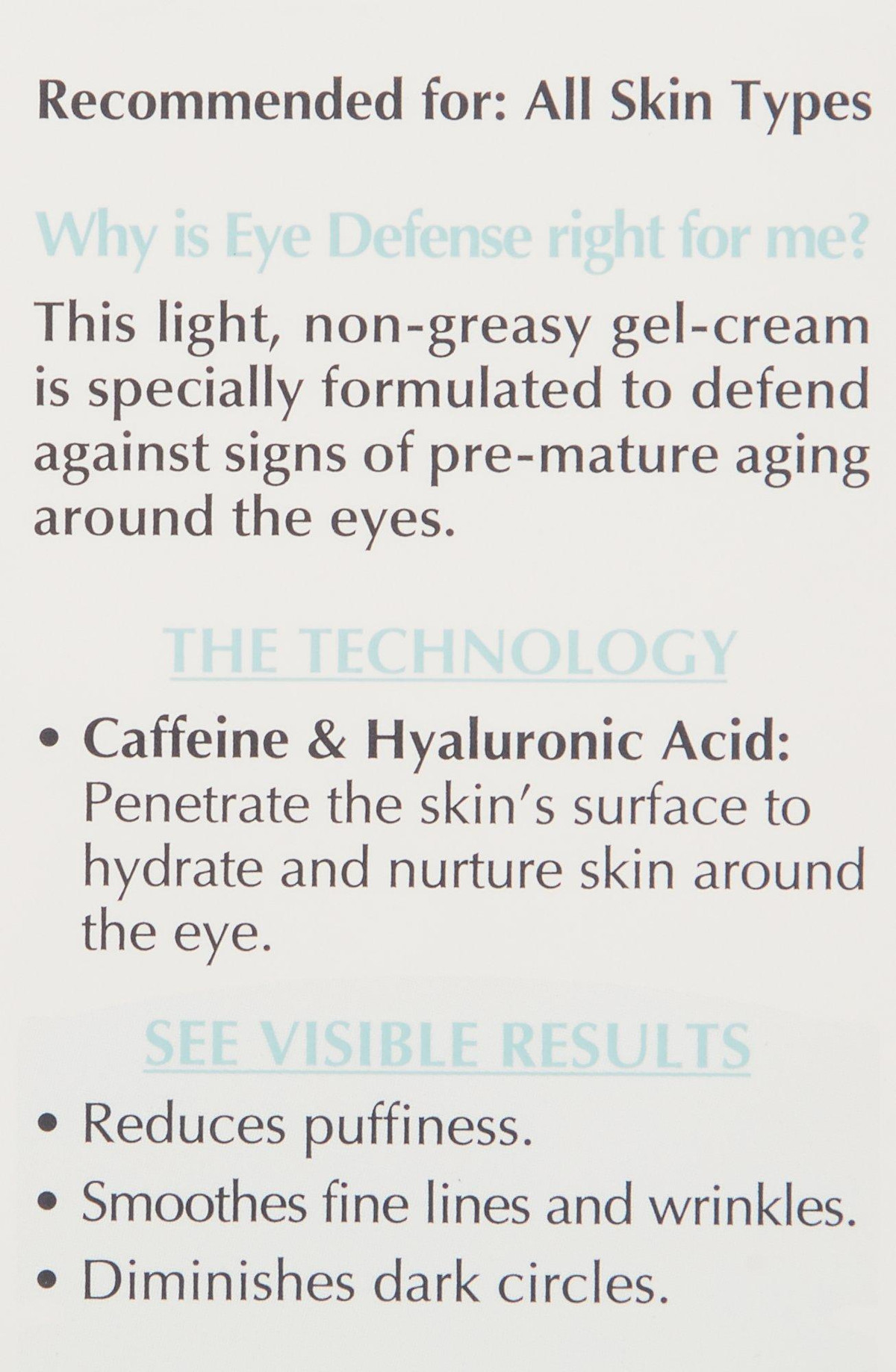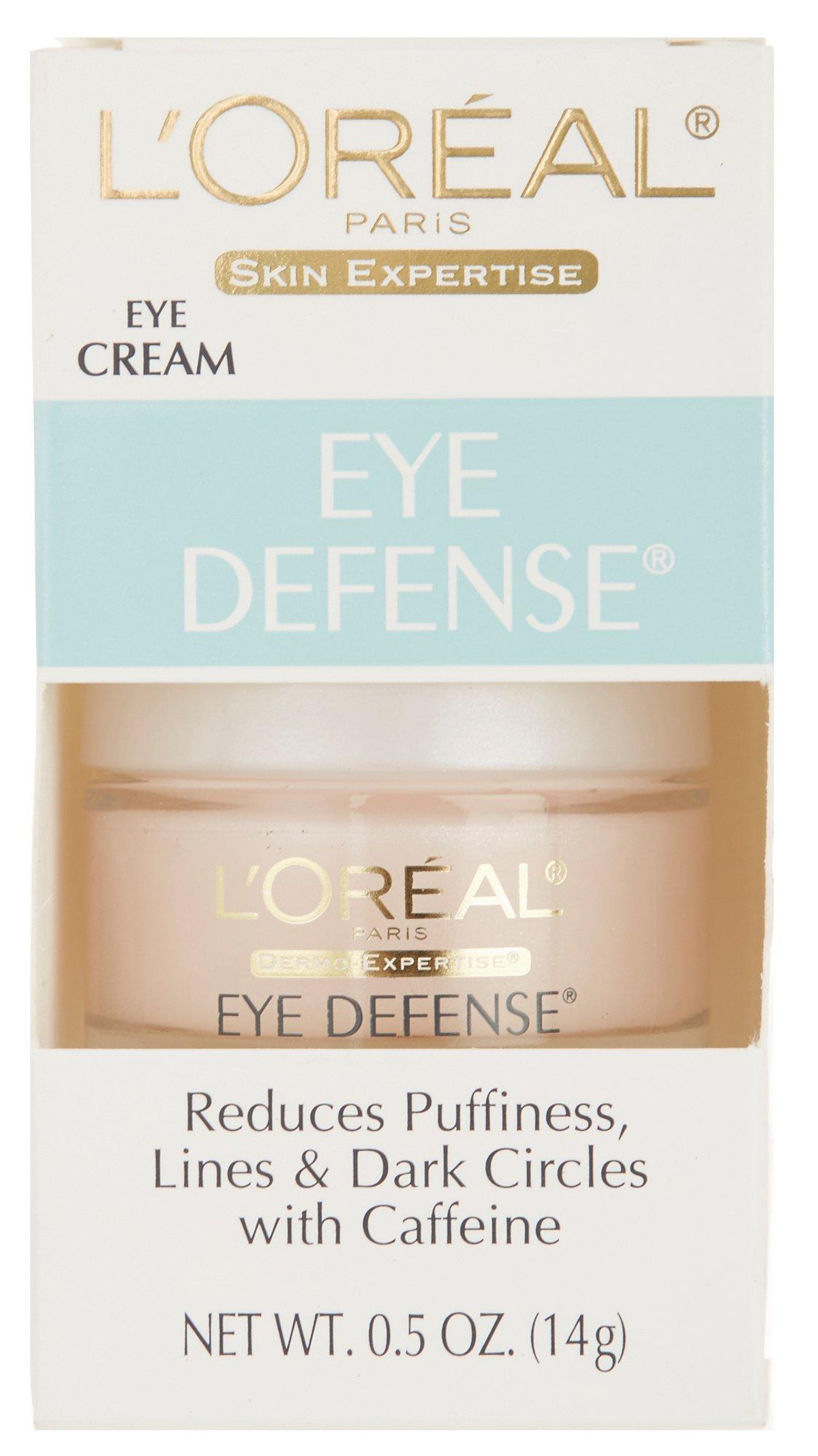 L’Oreal 0.5 oz. Skin Expertise Eye Defense Cream reduces puffiness, lines and dark circles with caffine. Safe for contact lens wearers and fragrance-free. 0.5 oz.