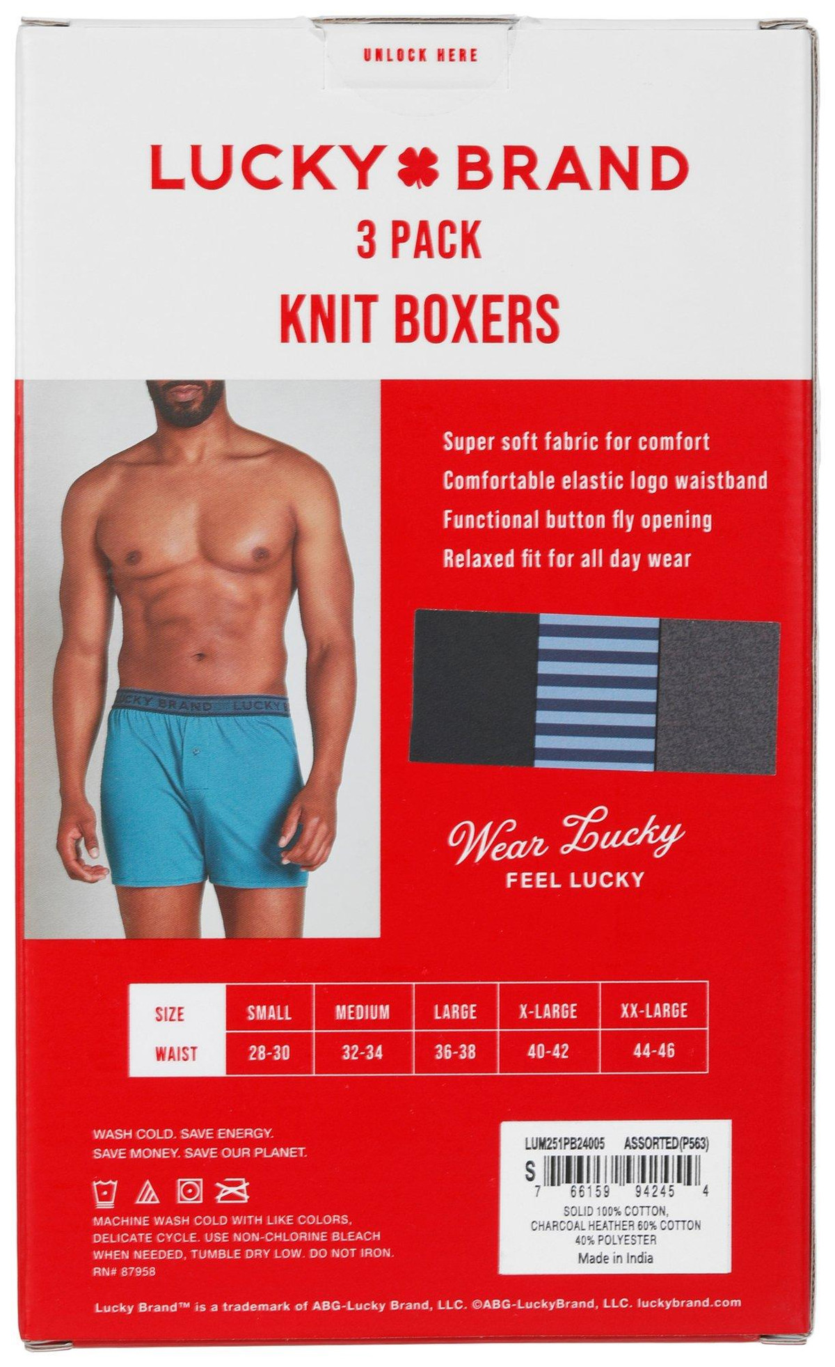 Stay comfortable every day with the Lucky Brand Mens 3-Pack Knit Boxers. Made from a soft cotton or cotton-blend fabric, these relaxed-fit boxers offer breathable comfort and easy movement.Fabrication: 60% Cotton, 40% Polyester.