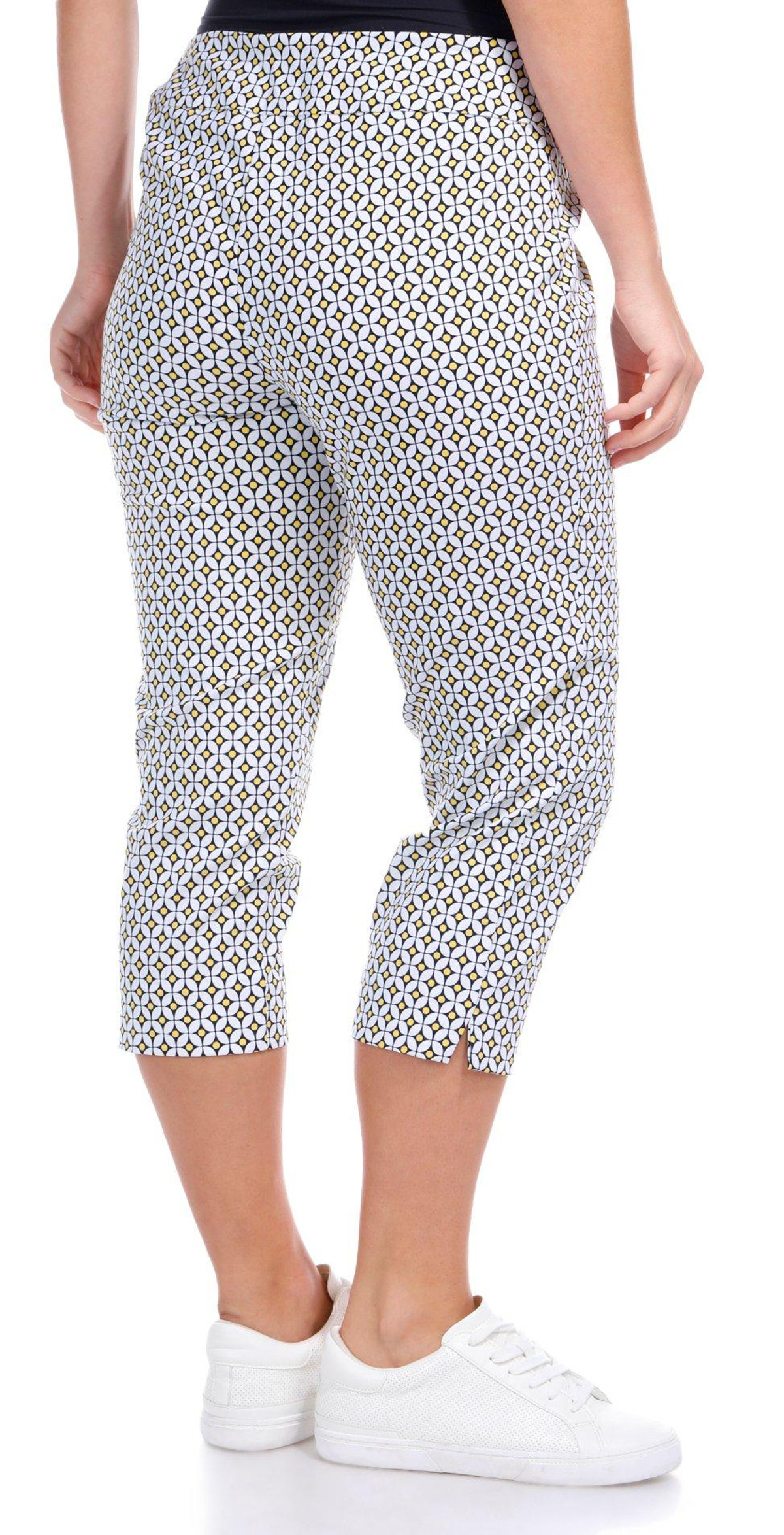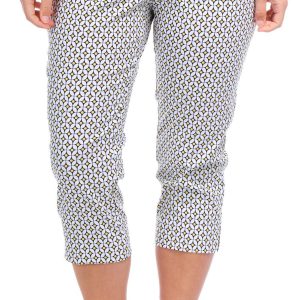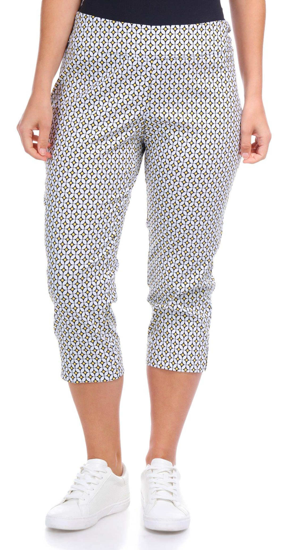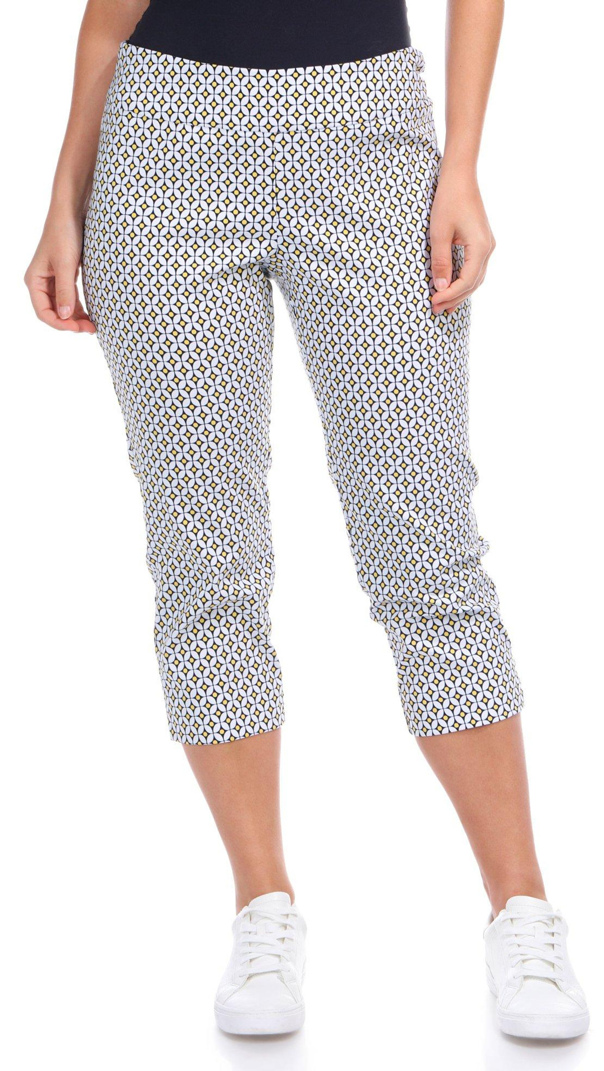 These womens capris feature a stylish print with a 22 inch inseam and a sleek modern fit. Made of nylon, rayon, and spandex they offer stretch and comfort with a pull on waistband making them a great choice for work or casual wear.
