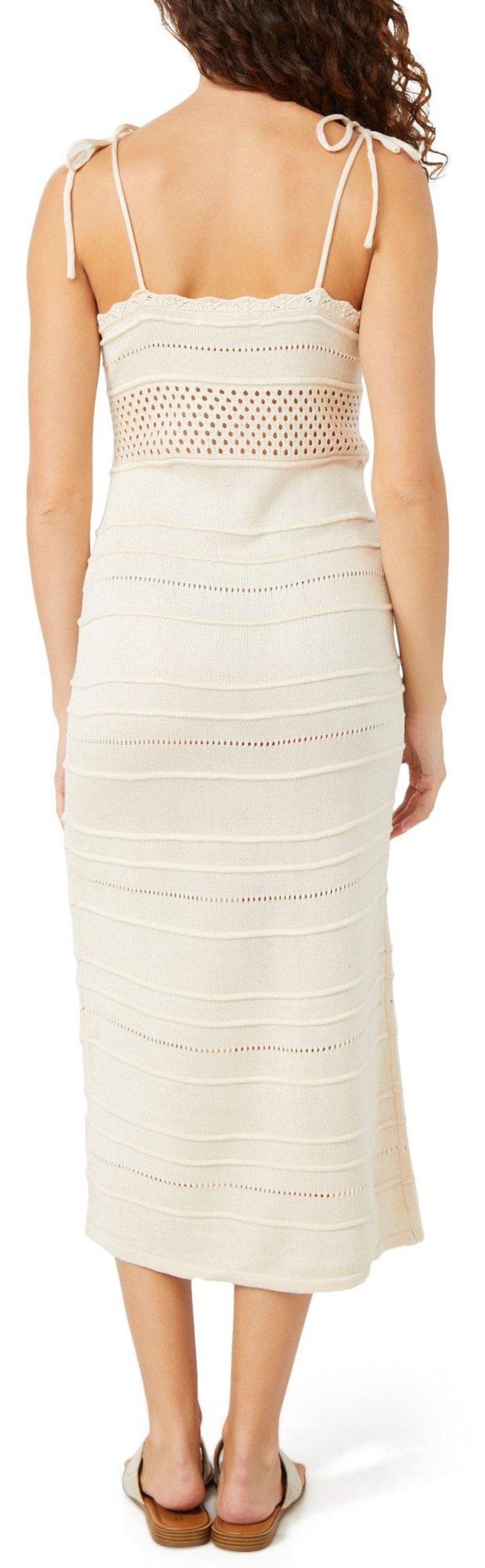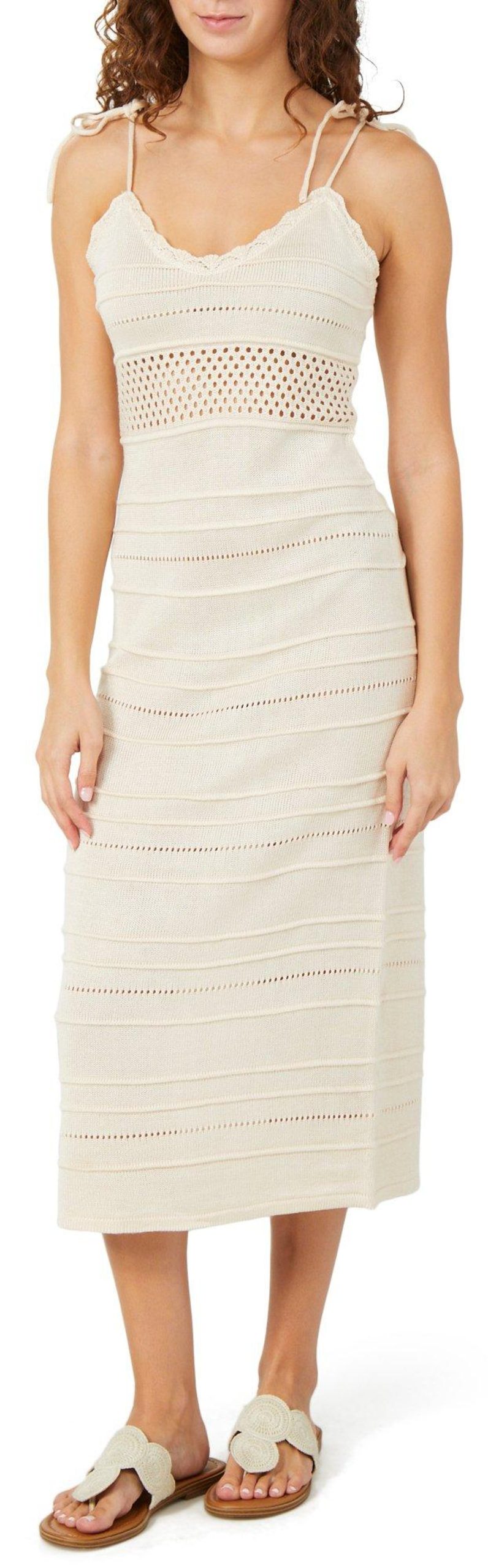 The Juniors Sleeveless Crochet Midi Dress, made from 100% acrylic, features a stylish solid crochet exterior. With its sleeveless design, v-neckline, and 40-inch length, this dress offers a chic and elegant look, perfect for any occasion. Fabrication 100% acrylic