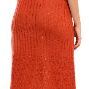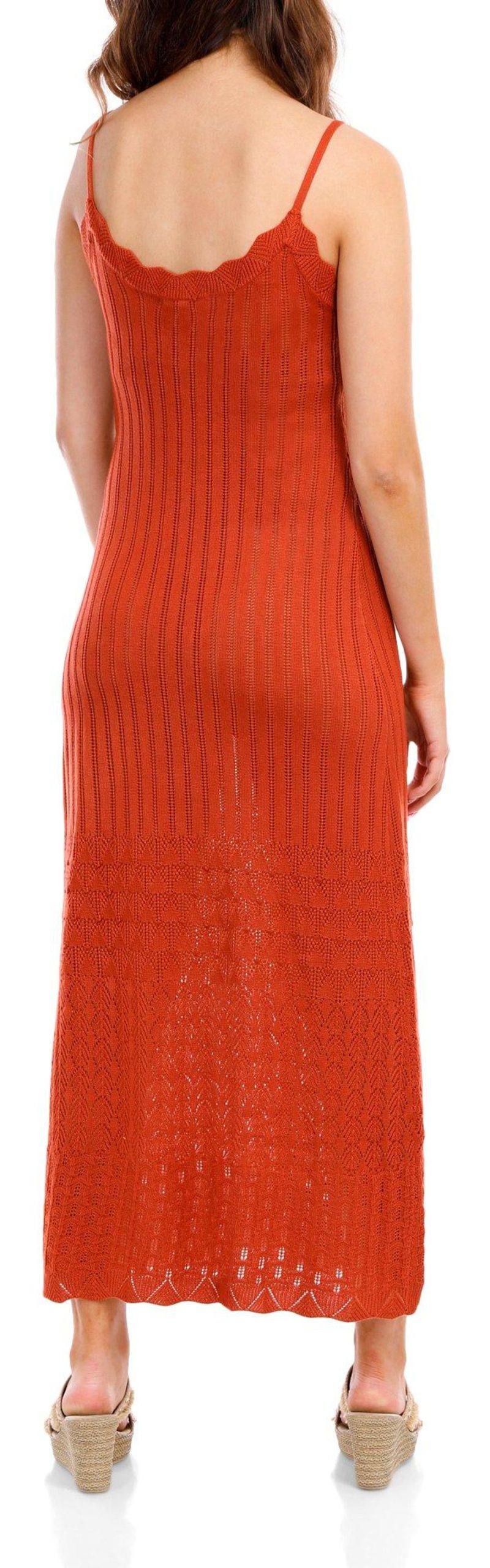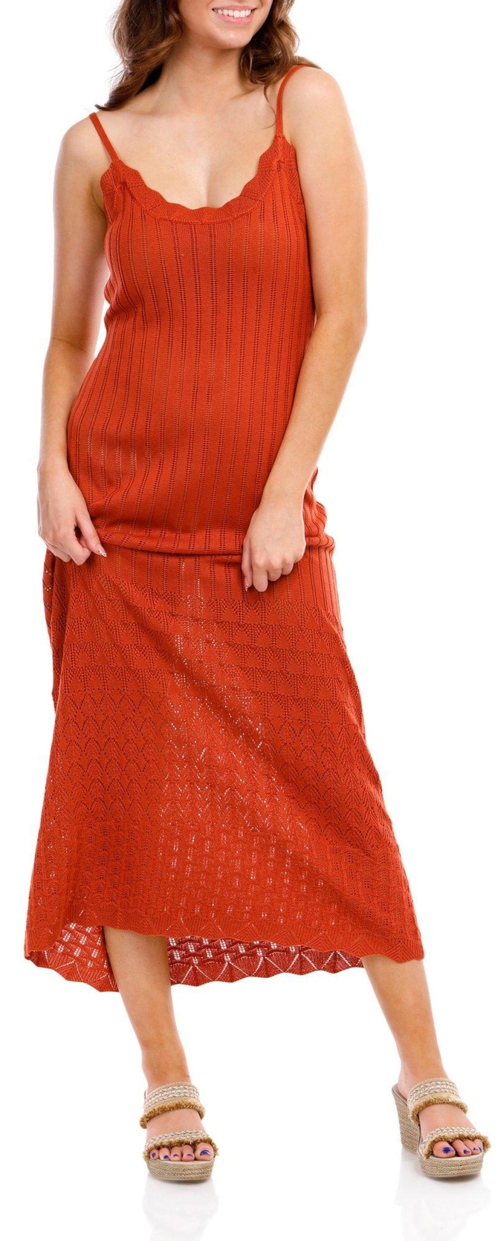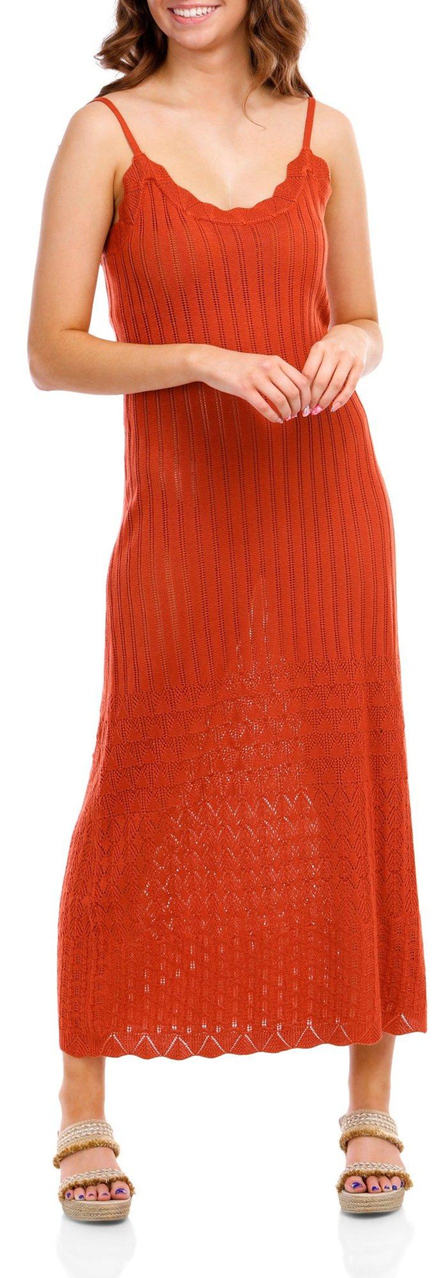 The Juniors Sleeveless Crochet Midi Dress, made from 100% acrylic, features a stylish solid crochet exterior. With its sleeveless design, scallop hem, scoop neckline, and 45-inch length, this dress offers a chic and elegant look, perfect for any occasion.