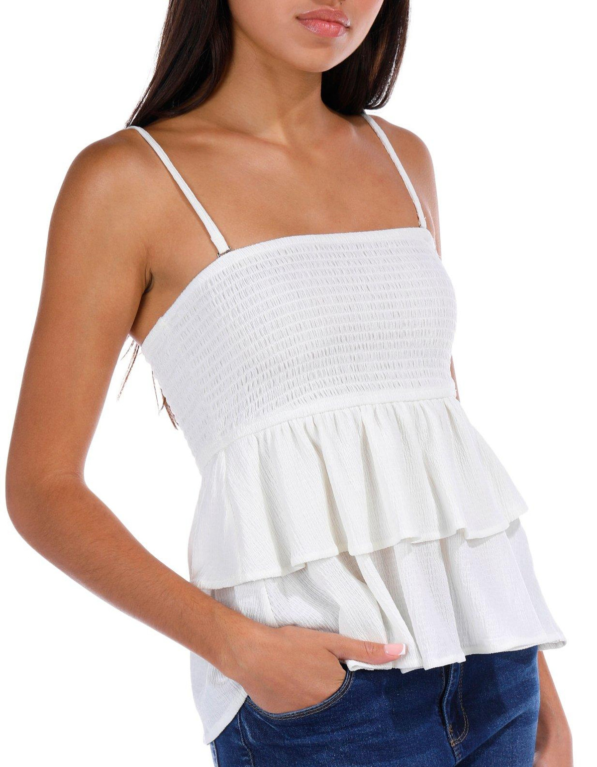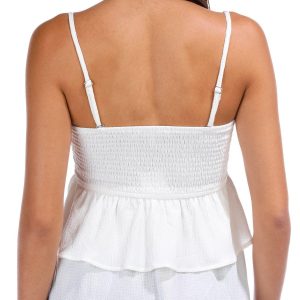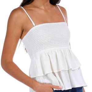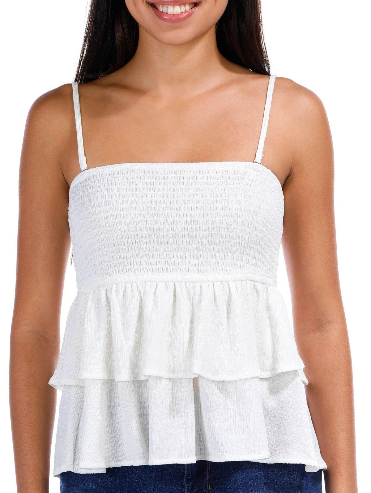 This Juniors Smocked Tube Top with Ruffles features a smocked design on top with ruffles at the hem, using a soft knit fabric, and has optional spaghetti straps. Fabrication is 97% Polyester, 3% Spandex. Top length measures approximately 25 in from shoulder.