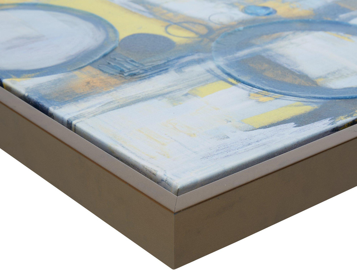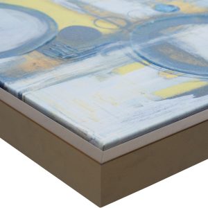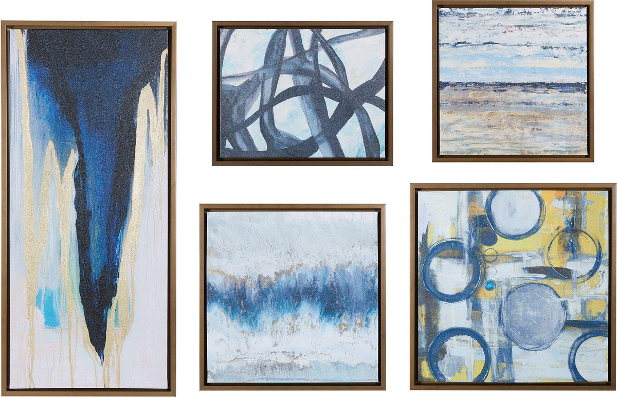The Madison Park Blue Bliss Gallery Art canvas set features striking shades of blues, yellows, and neutrals. Beautiful cohesive set showcases sporadic gold foil accents add eye-catching flair, while cardboard backing provides structure and support. 1 piece measures 19.5”W x 19.5”H x 1.5”D. 1 piece measures 36.5”W x 16.5”H x 1.5”D. 1 piece measures 21.5”W x 21.5”H x 1.5”D. 1 piece measures 17.5”W x 17.5”H x 1.5”D. 1 piece measures 15.5”W x 19.5”H x 1.5”D.