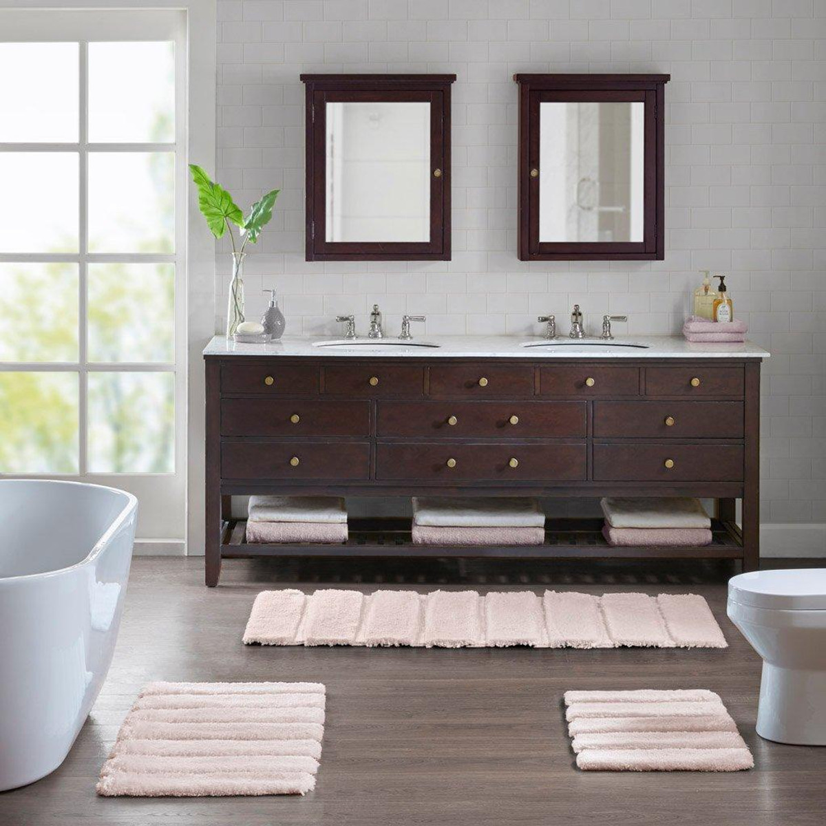 Elevate your bath space with the Madison Park Tufted Pearl Channel Rug. Crafted from premium macro-spun polyester, its high-low stripe design and subtle sheen bring refined texture and elegance. Soft, durable, and indulgent underfoot. Perfect for a serene, spa-like retreat. Machine wash for easy care.