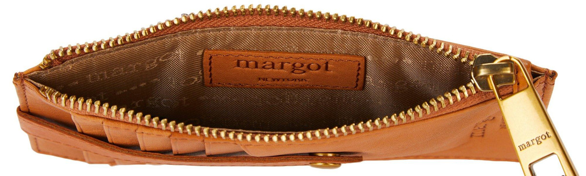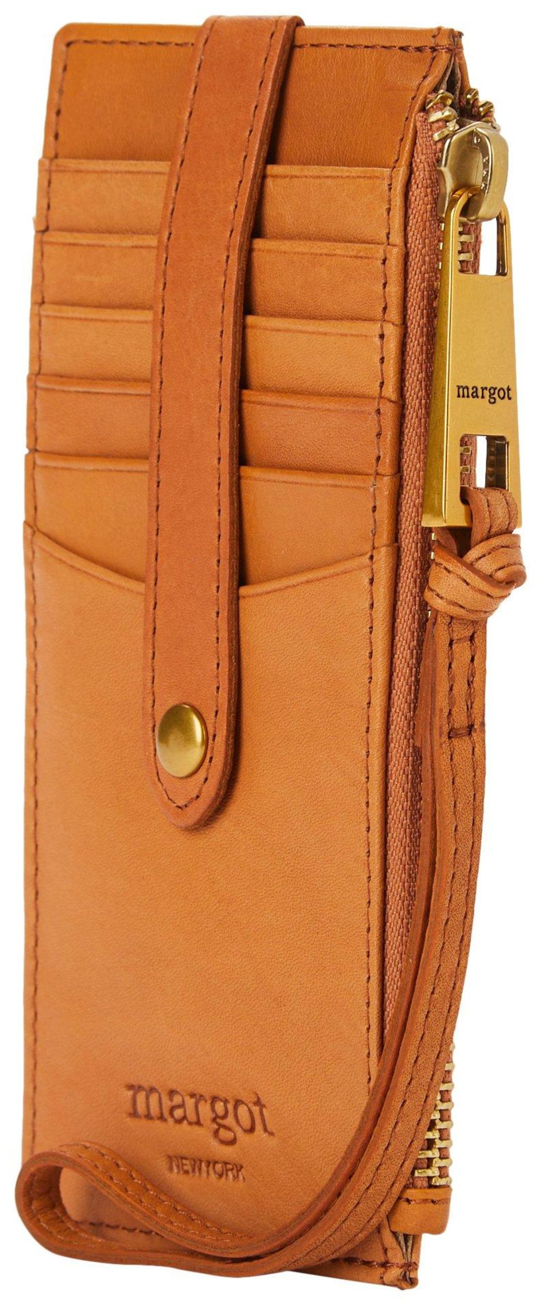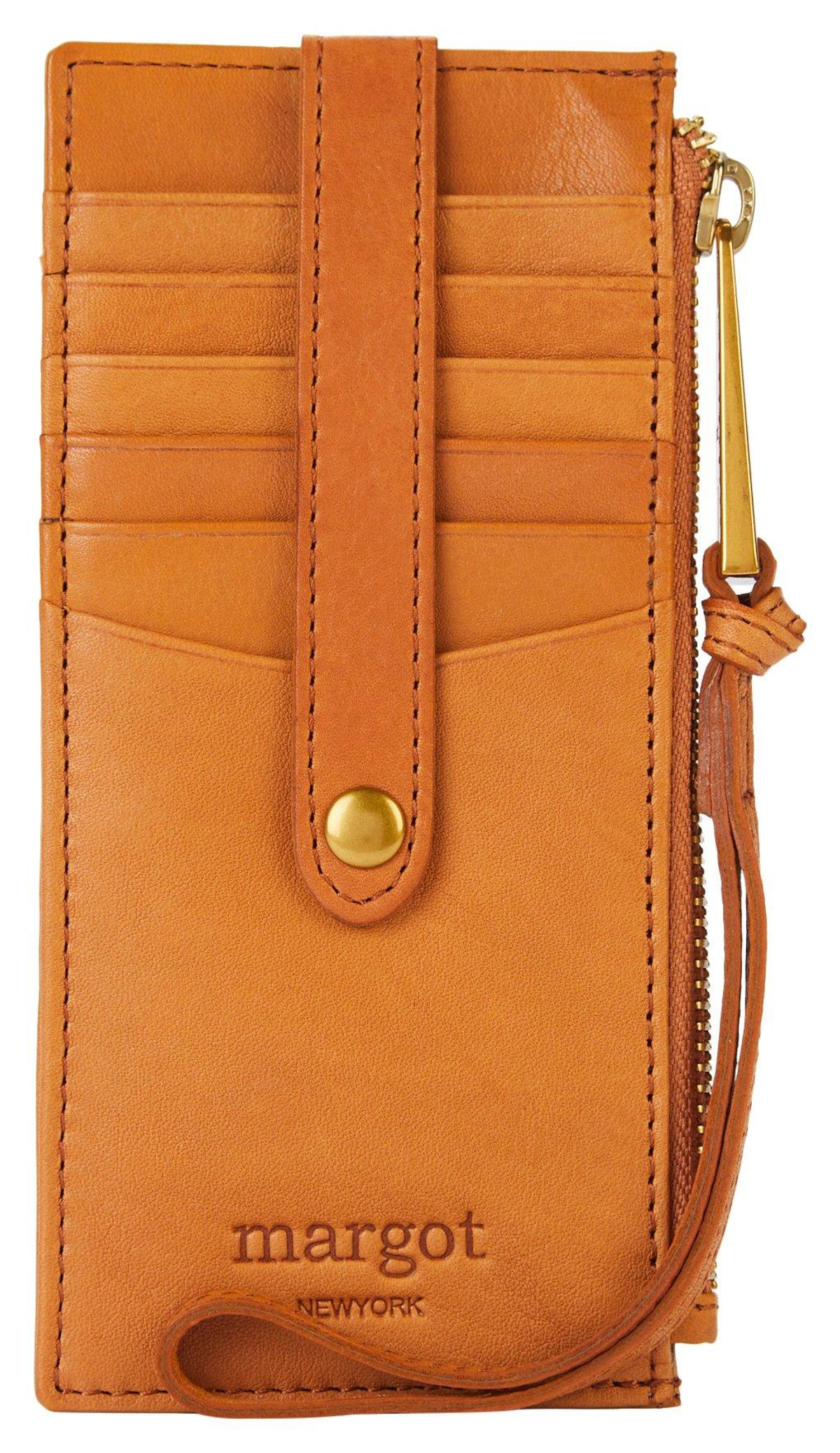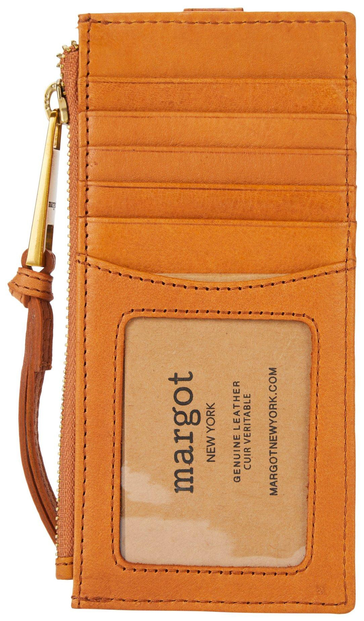 Upgrade your accessories with this timeless genuine leather Faye card case wristlet wallet! Constructed of genuine leather, ID window slot, 11 card slots w/ protective strao on one side and zippered interior compartment.Measures approximately 3 in. W x 6.5 H in.