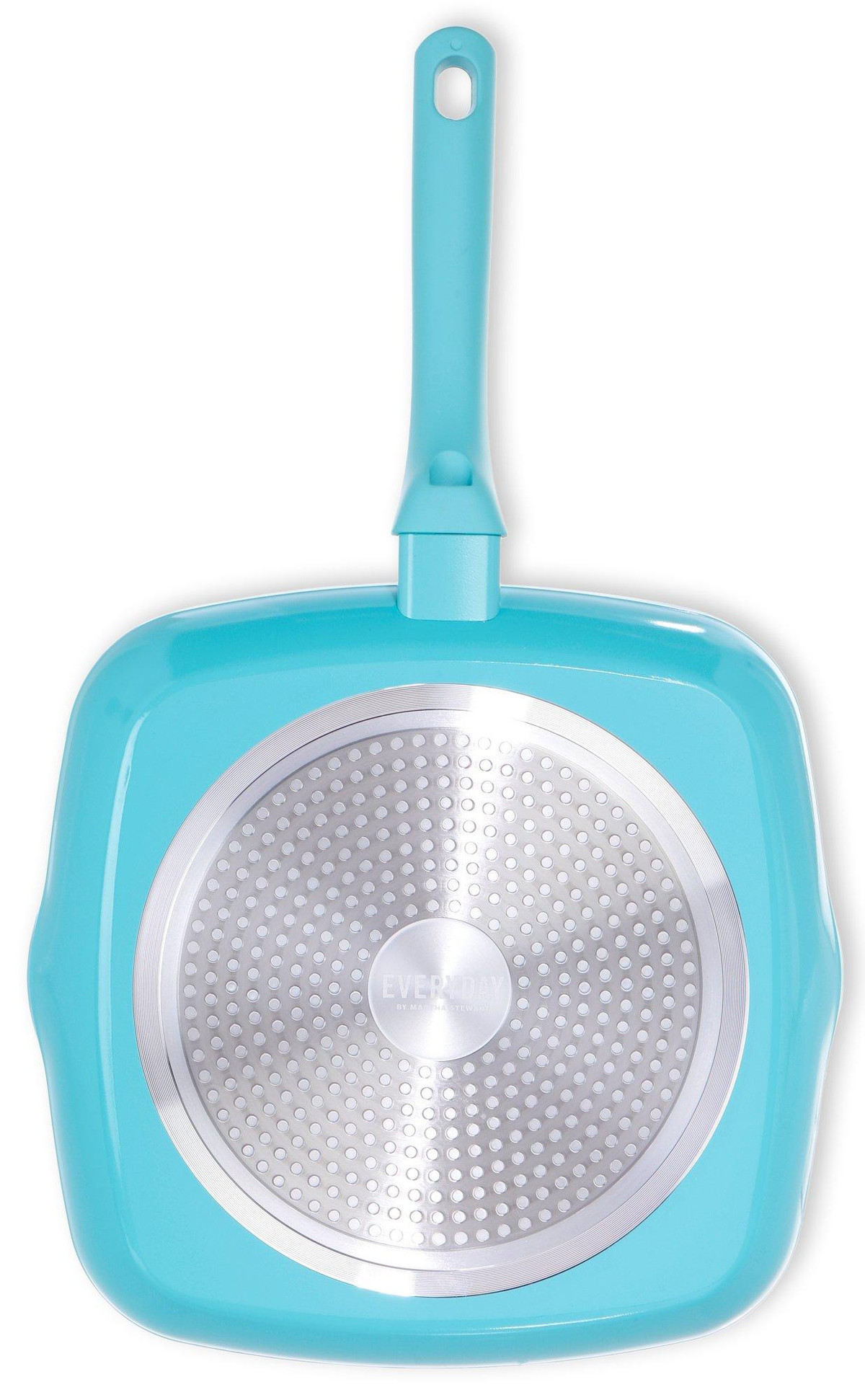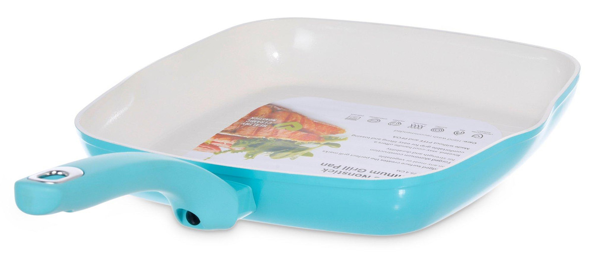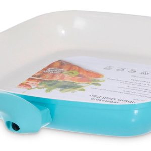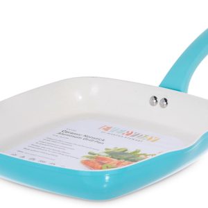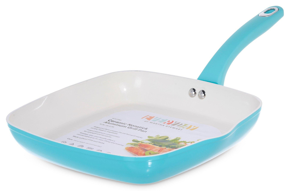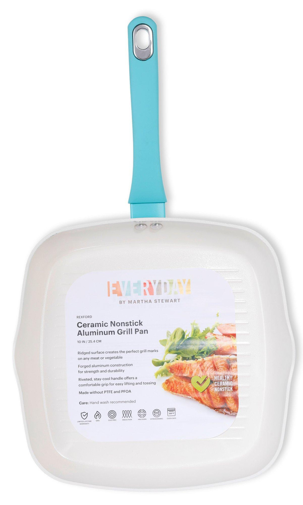 Grill your favorite meals in style with the Rexford 10 Inch Ceramic Nonstick Aluminum Square Grill Pan by Martha Stewart. This square grill pan is constructed with a forged aluminum body for strength and durability and features a riveted stay-cool handle that offers a comfortable grip when lifting and tossing.