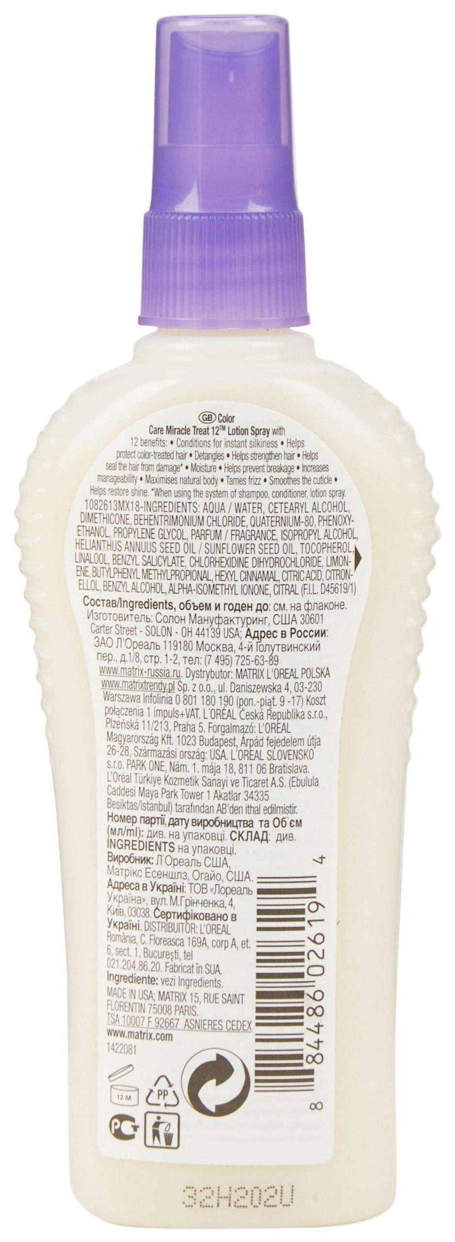 Treat your hair to 12 benefits in one step with Total Results Miracle Treat Lotion Spray. This multitasking spray boosts shine, reduces frizz, detangles, protects from heat, and more. Lightweight and safe for color treated hair. Contains 5.1 fl oz.