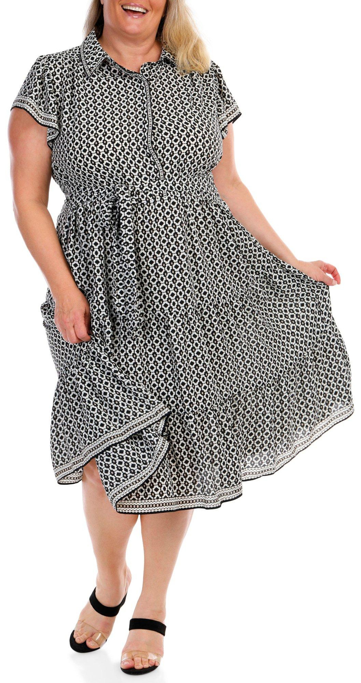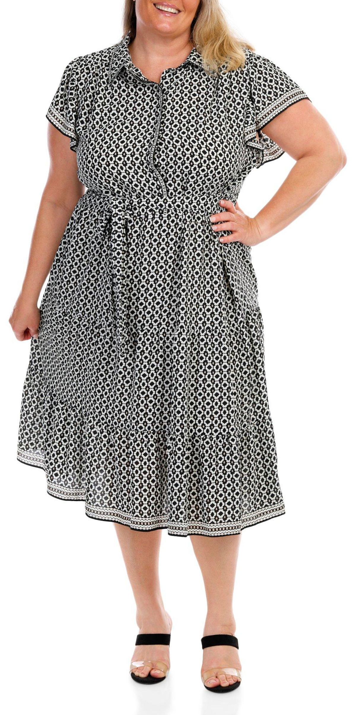 Step out in style with the Plus Geo Print Midi Dress. Made from 100% polyester, this dress features a chic geometric print. It boasts a button-down neckline with a collar and a waist tie, enhancing your silhouette. With a length of 44 inches, it’s perfect for any occasion, combining comfort and elegance effortlessly.