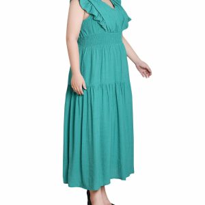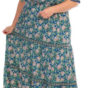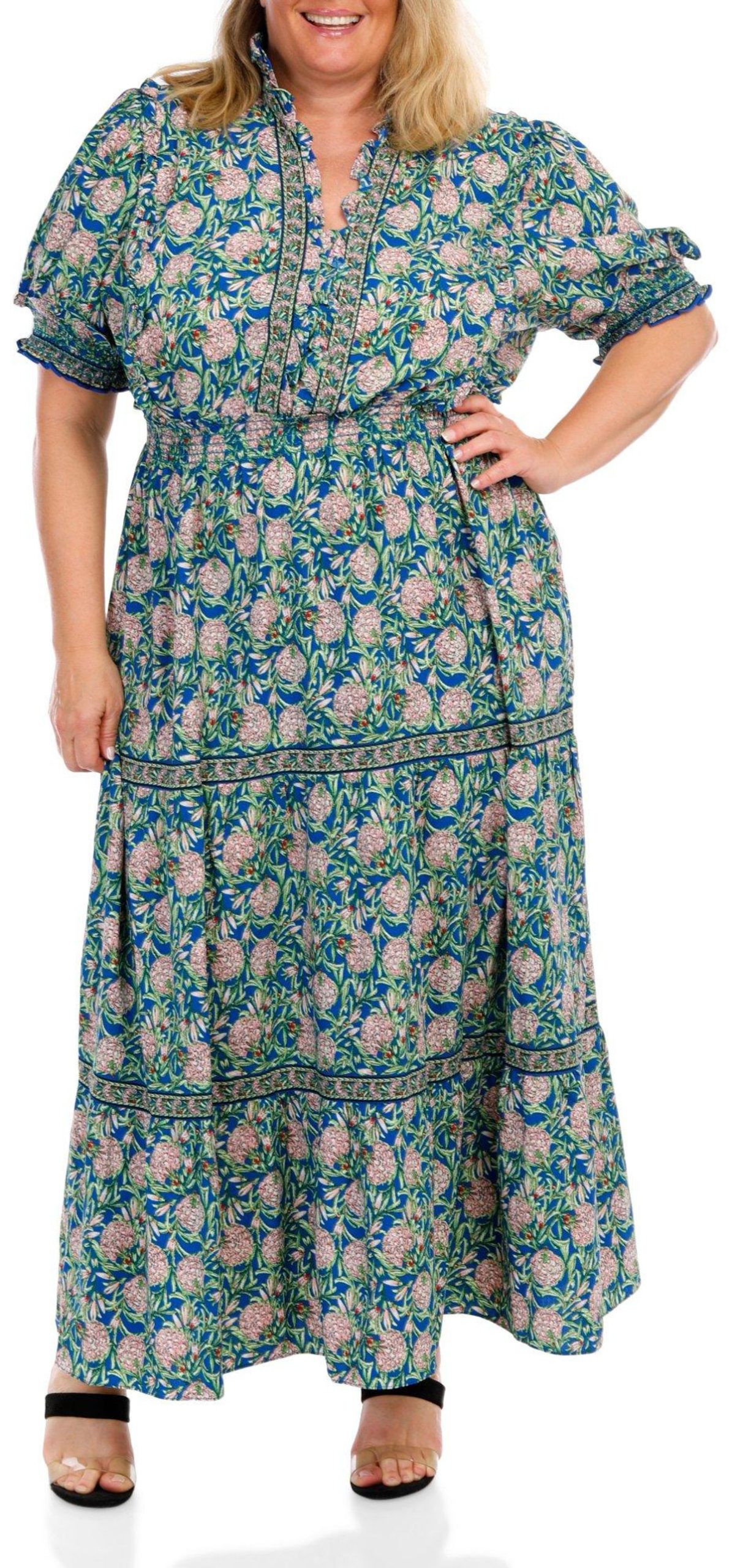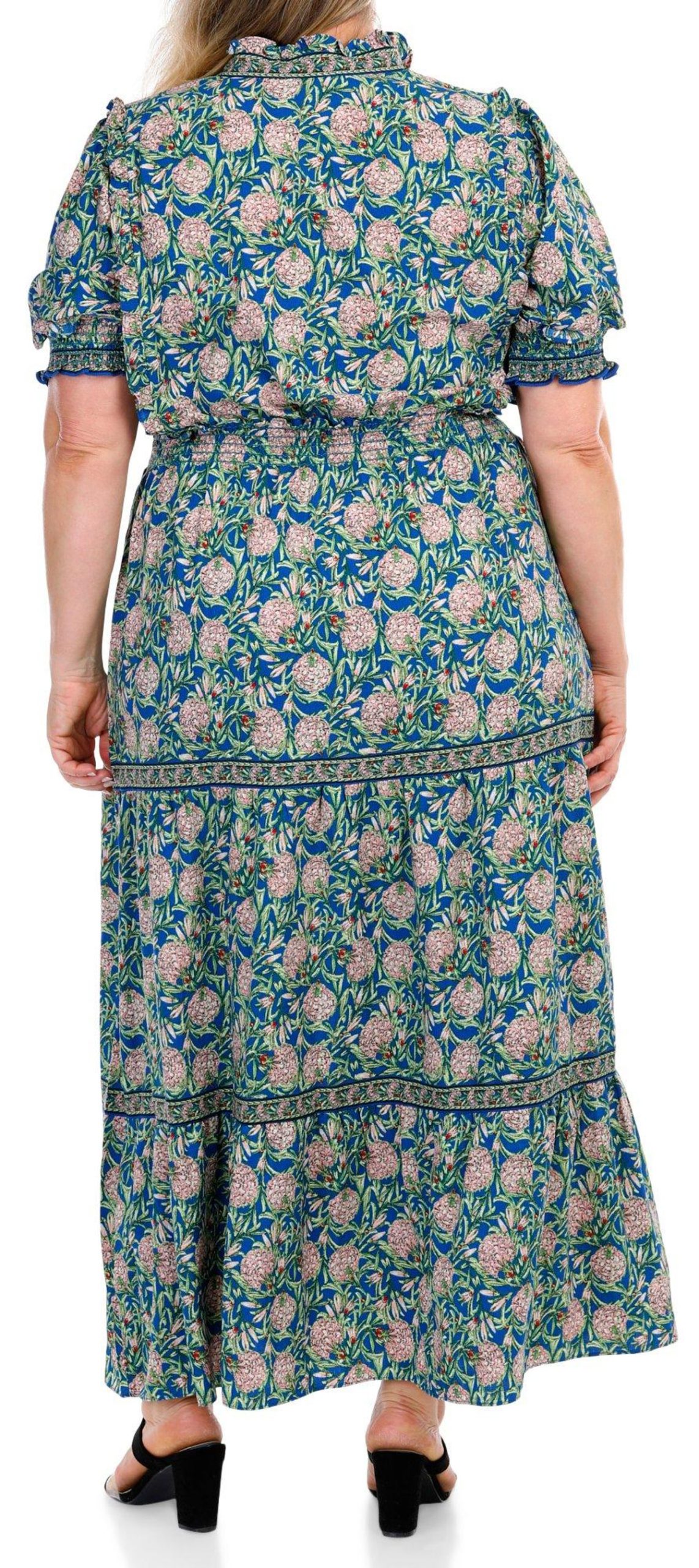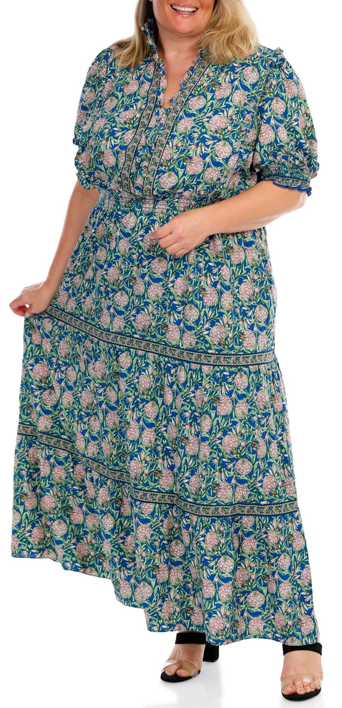 Embrace a tropical vibe with the Plus Pineapple Tiered Maxi Dress. Made from a blend of polyester and spandex, this dress features a stylish vintage pineapple design. It boasts a split neckline, short ruffle sleeves, and smocked detail on the waist, enhancing your silhouette. The tiered maxi skirt adds a touch of elegance, with a length of 50 inches. Perfect for any occasion, this dress combines comfort and style effortlessly.