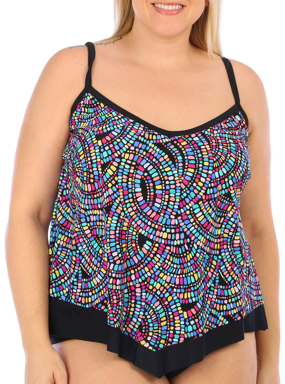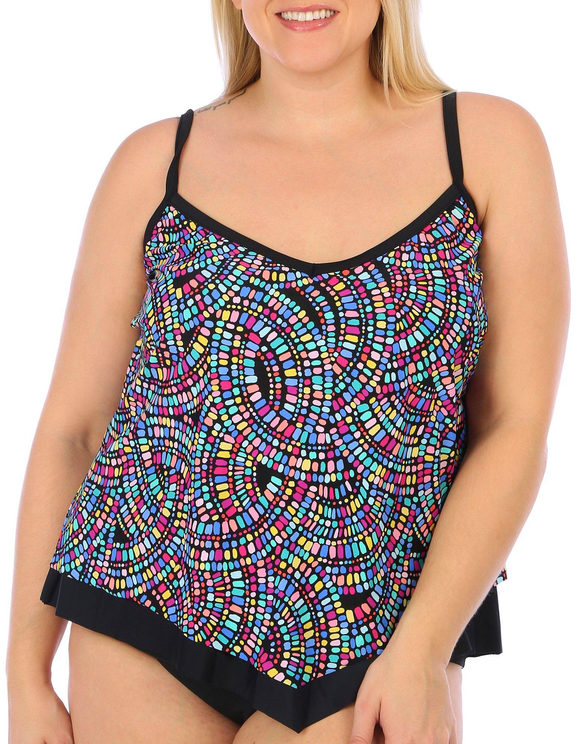 Get ready for your next trip to the beach or pool with this colorful tankini top! It features a floral print design, a v-neckline, molded cups, adjustable straps, and fluttering layers. Fabrication 82% nylon and 18% Lycra.