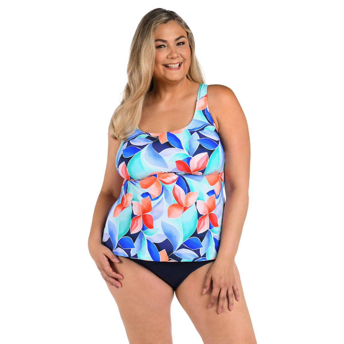 Featuring bold geometric floral shapes in vibrant shades of blue, coral, and purple, this tankini top offers a dynamic, layered, and abstract design. Styled with a flattering scoop neck, this swim top features molded cups and thick, over-the-shoulder straps that keep you comfortably supported. Fabrication 82% nylon and 18% Lycra.