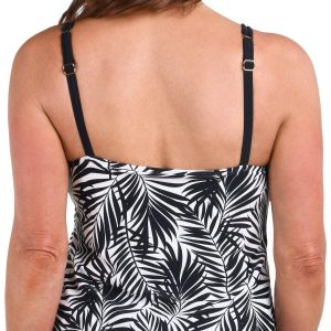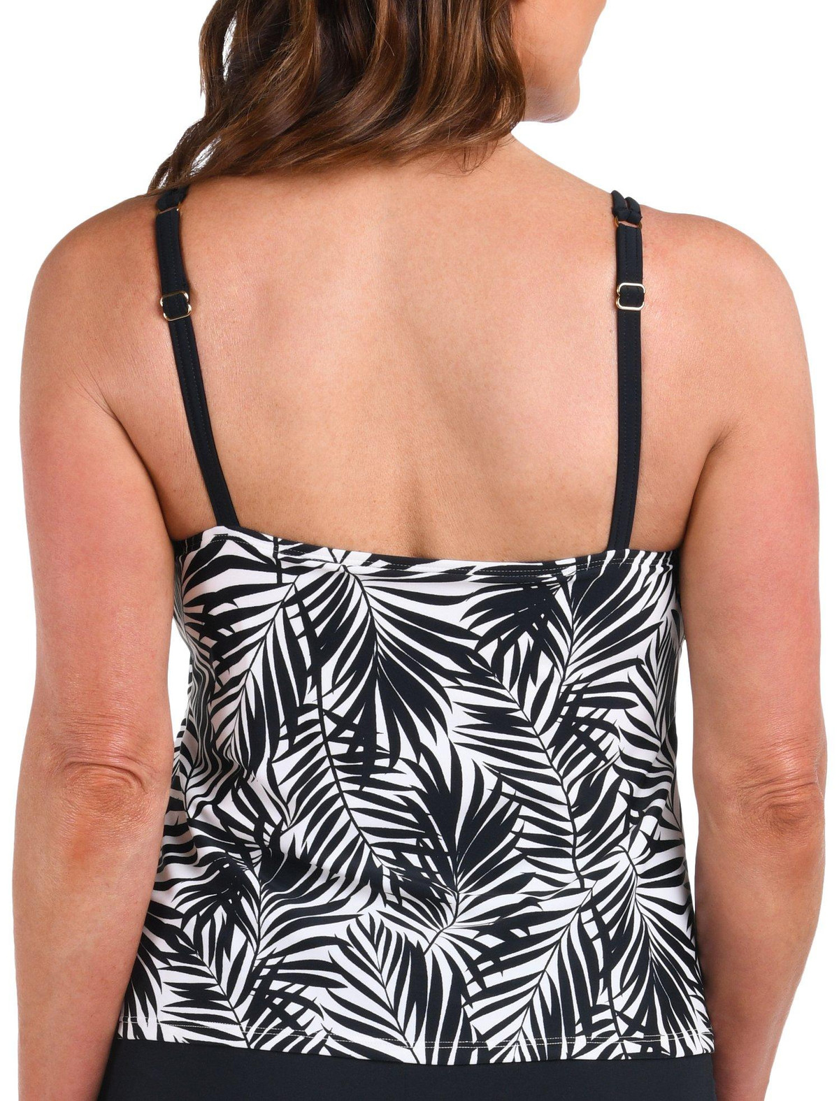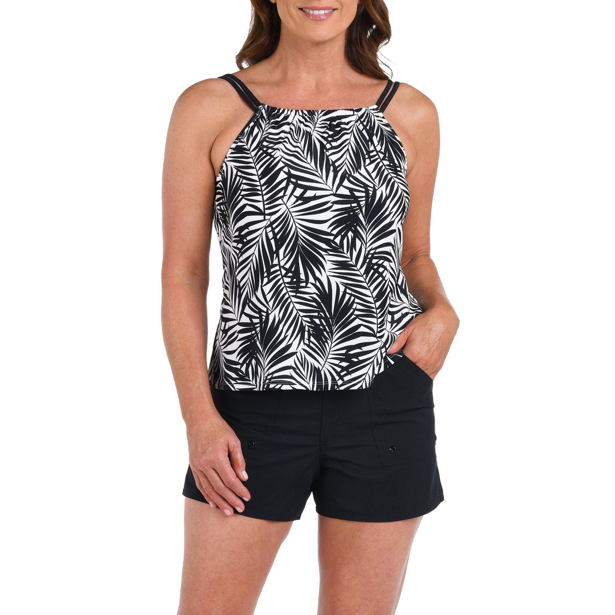 This Palm Retreat hi neck tankini top features a vibrant pattern composed of a beautiful palm design against a black background. Molded cups offer comfortable support with or without the adjustable removable straps. Fabrication 82% nylon, 18% Lycra Xtra Life elastane.