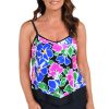 This tankini top features a striking black-and-ivory design of overlapping palm leaves, creating a bold, high-contrast tropical motif. Ruffled layers create a loose, flowy fit that subtly disguises your stomach and waist, while a scoop neck and molded cups flatter the bust. Fabrication 82% nylon, 18% Lycra Xtra Life elastane.