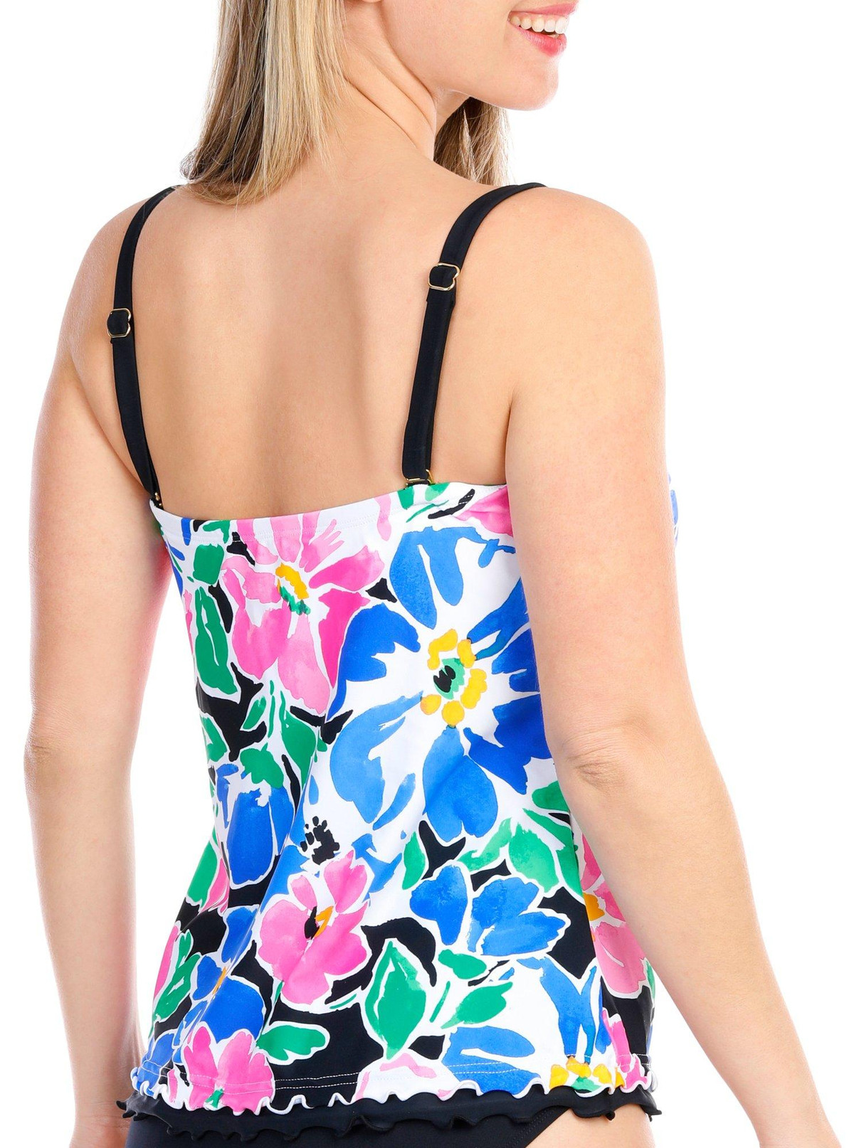 Make waves with this Summer Splash Bandeau Tankini. This vibrant swimsuit features a colorful print pattern that captures the essence of summer. The bandeau style offers a sleek and modern look, while the adjustable straps ensure a perfect fit. The lettuce edge trim adds a playful and feminine touch, making this tankini both stylish and unique. Perfect for beach days or poolside lounging. Fabrication 82% nylon, 18% Lycra Xtra Life elastane.