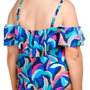 Make waves with this Summer Splash Bandeau Tankini. This vibrant swimsuit features a colorful print pattern that captures the essence of summer. The bandeau style offers a sleek and modern look, while the adjustable straps ensure a perfect fit. The lettuce edge trim adds a playful and feminine touch, making this tankini both stylish and unique. Perfect for beach days or poolside lounging. Fabrication 82% nylon, 18% Lycra Xtra Life elastane.