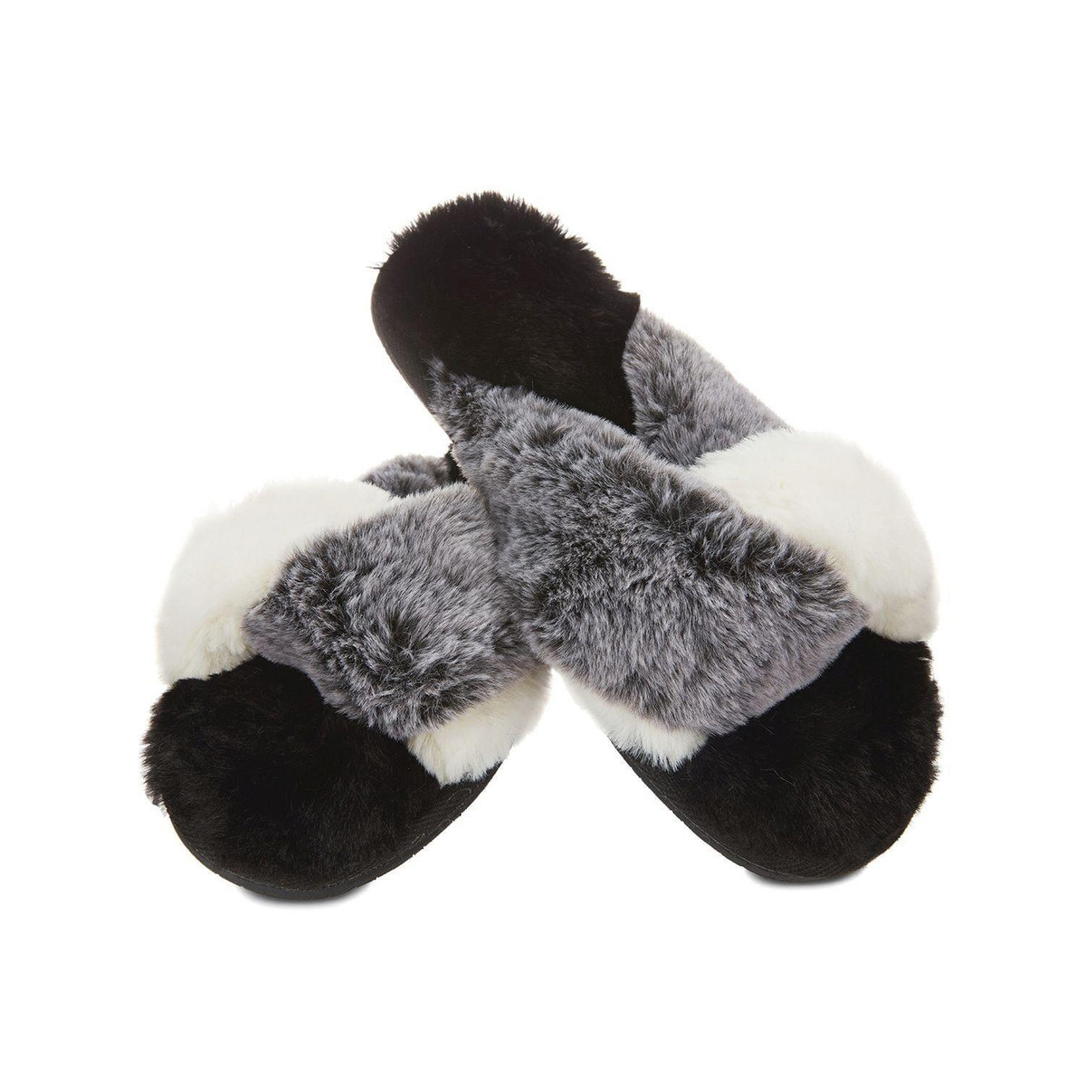 Our Rita Slippers combine classic Hollywood starlet fashion with high quality comfort for a pair of slippers you’ll always want to wear. This multi-tonal open toe pair has a memory foam insole and is covered in plush faux fur in a looped halter design.