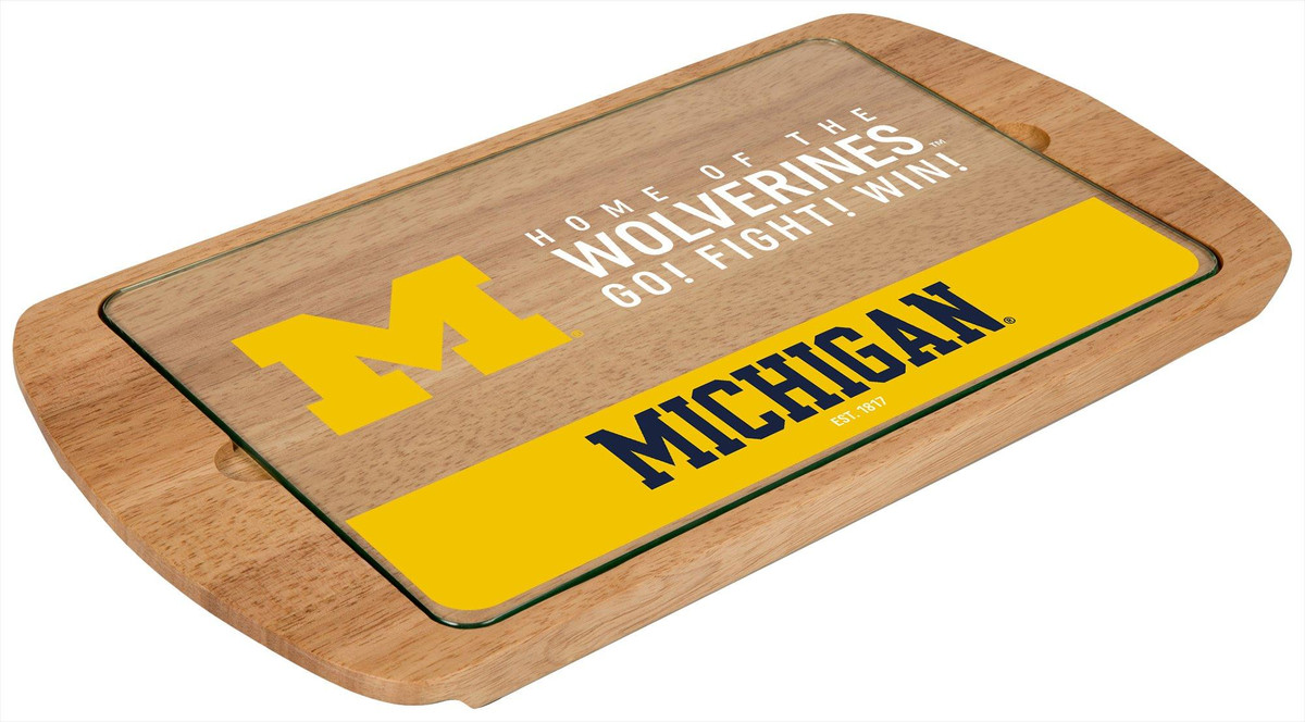 Billboard Glass Top Serving Tray is a rubberwood cutting board with a removable and customizable glass plate top that features Michigan Wolverines Logo. Glass is tempered and measures: 14 x 9.875 x .2 inches. Rubberwood base measures 17.5 x 9.75 x 7.55 inches.