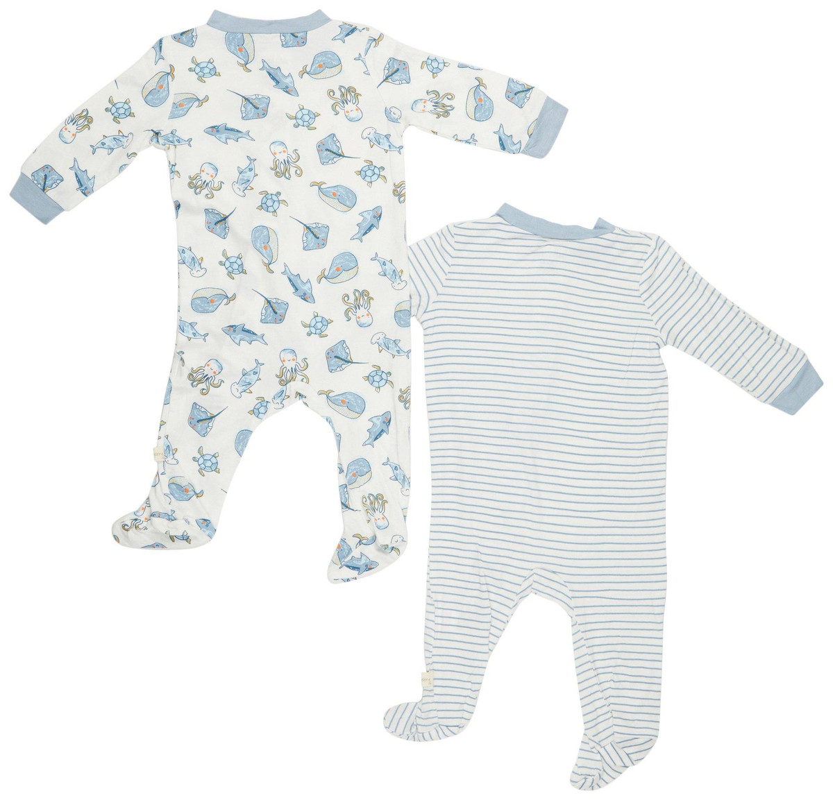 Wrap your little one in cozy comfort with this Baby Sleeper 2-Pack! Made from soft and breathable bamboo fabric, these sleepers are cool to the touch and perfect for restful nights. One features a classic striped design, while the other showcases a playful ocean life print. Designed with footed bottoms and a full-length zipper from neck to ankle, they allow for easy changes. The crew neck and snug fit ensure warmth and flexibility, making this set a must-have for bedtime or lounging.
