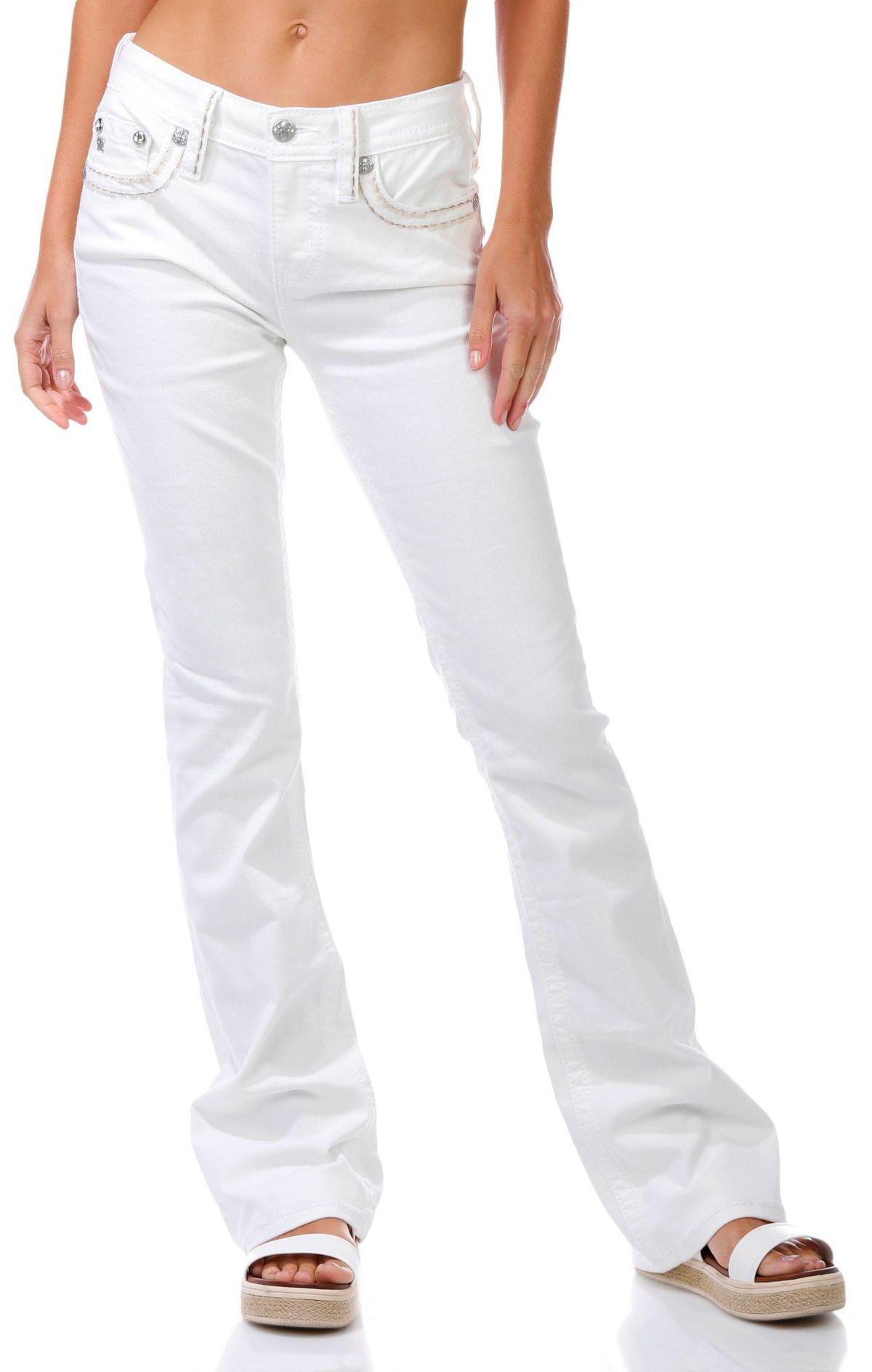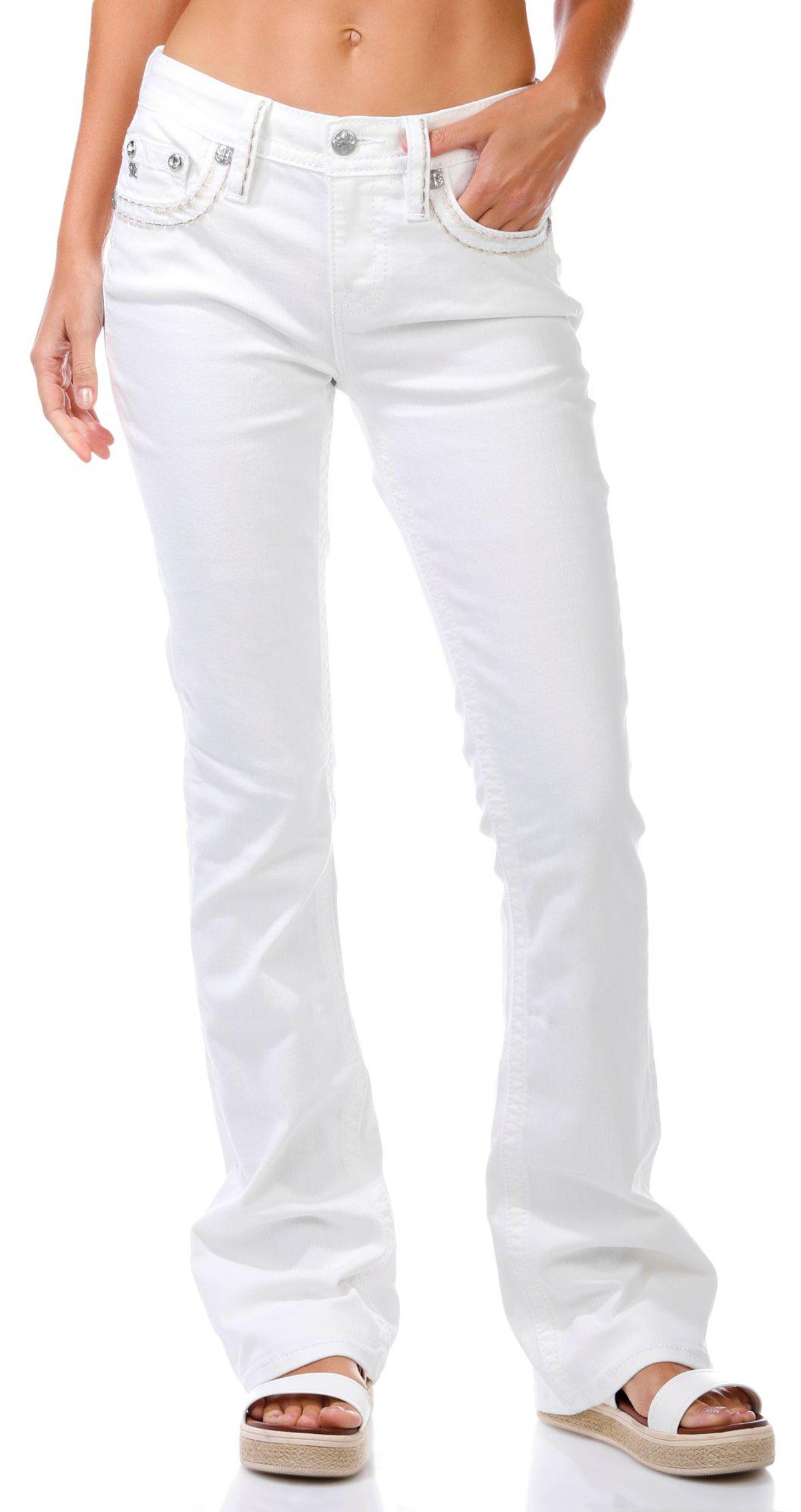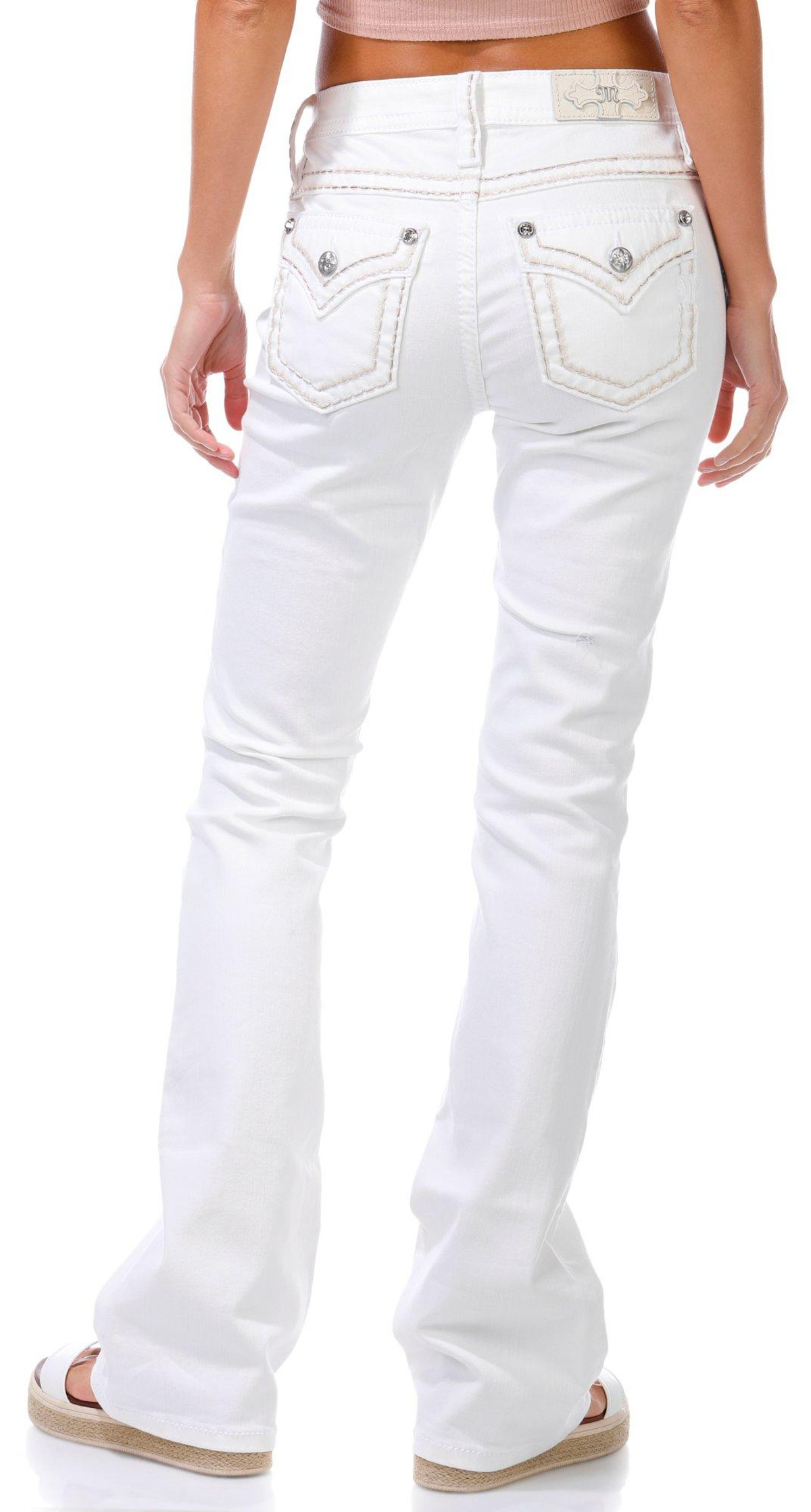 The Women’s Mid Rise Boot Cut Jeans offer a flattering fit with a classic mid rise and boot cut. Featuring a button-fly zip closure and a 5 pocket design, these jeans are finished with stitching on the back pockets for a stylish touch.