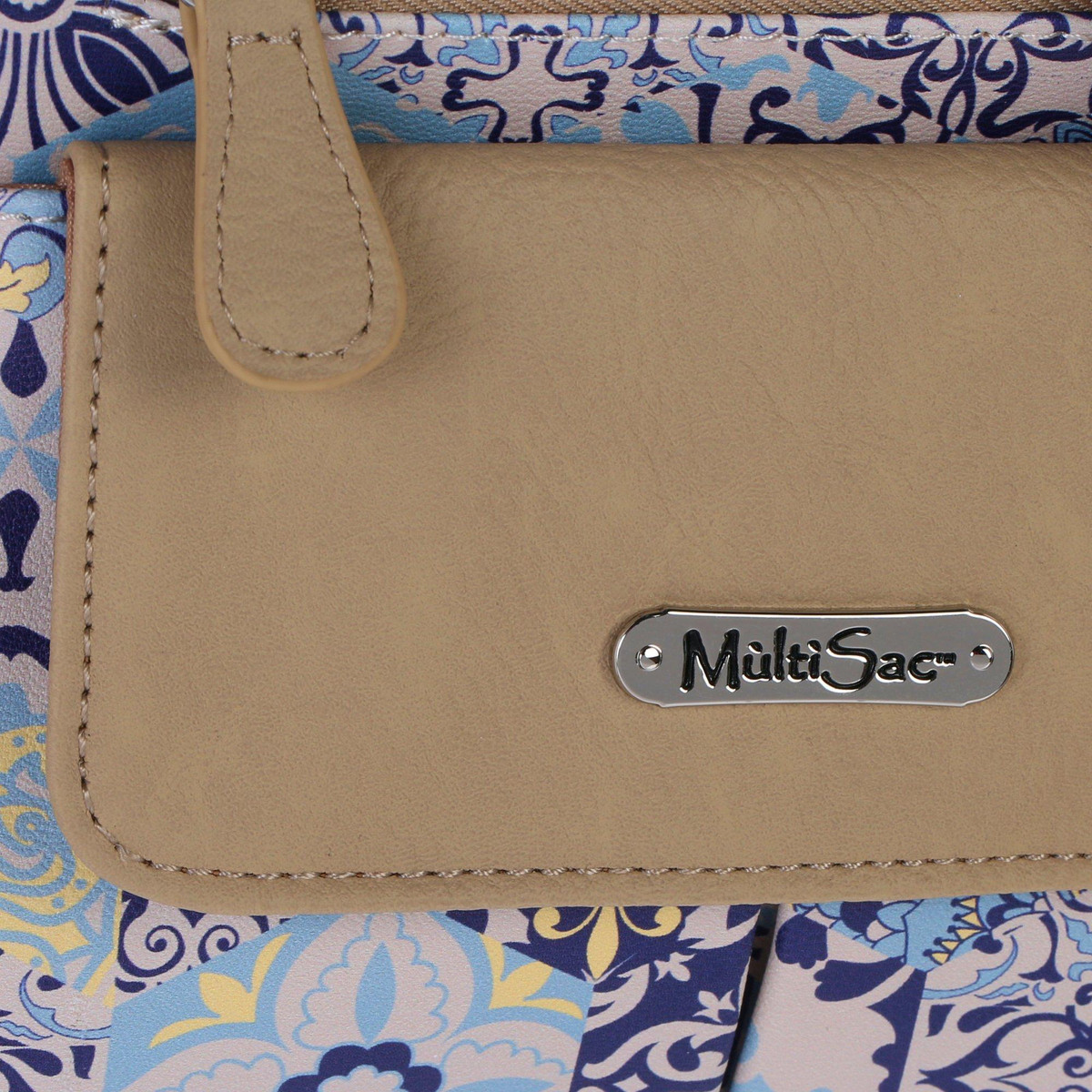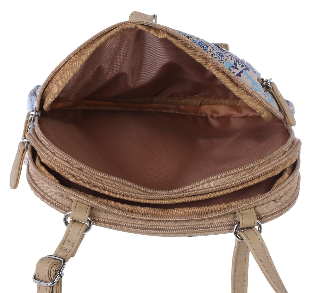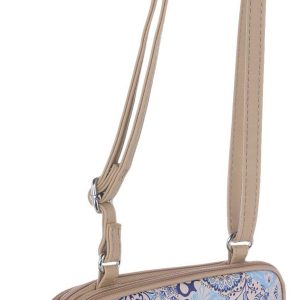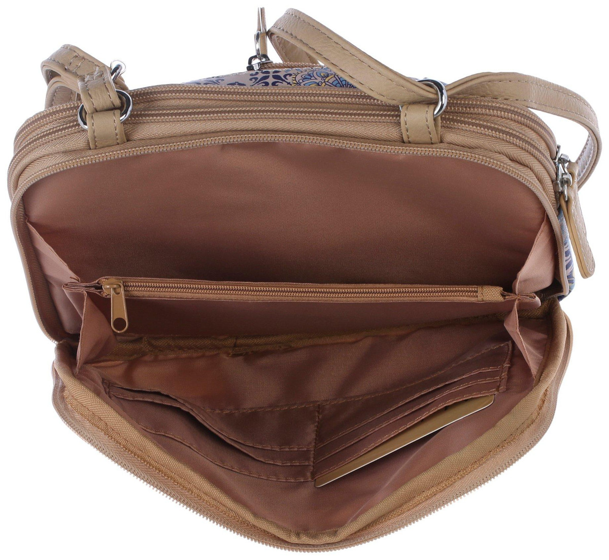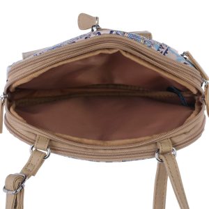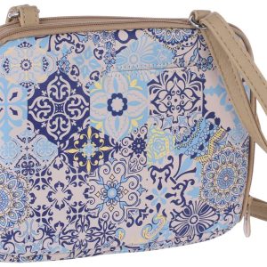 The Zippy crossbody handbag features an adjustable crossbody strap, a front flap pocket, two zipper pockets, one rear slip pocket, two main zip compartments, and one zip-around compartment. The rear compartment contains one zipper divider pocket, and six credit card slots. Measures approximately 9.5 in x 3 in x 7 in.
