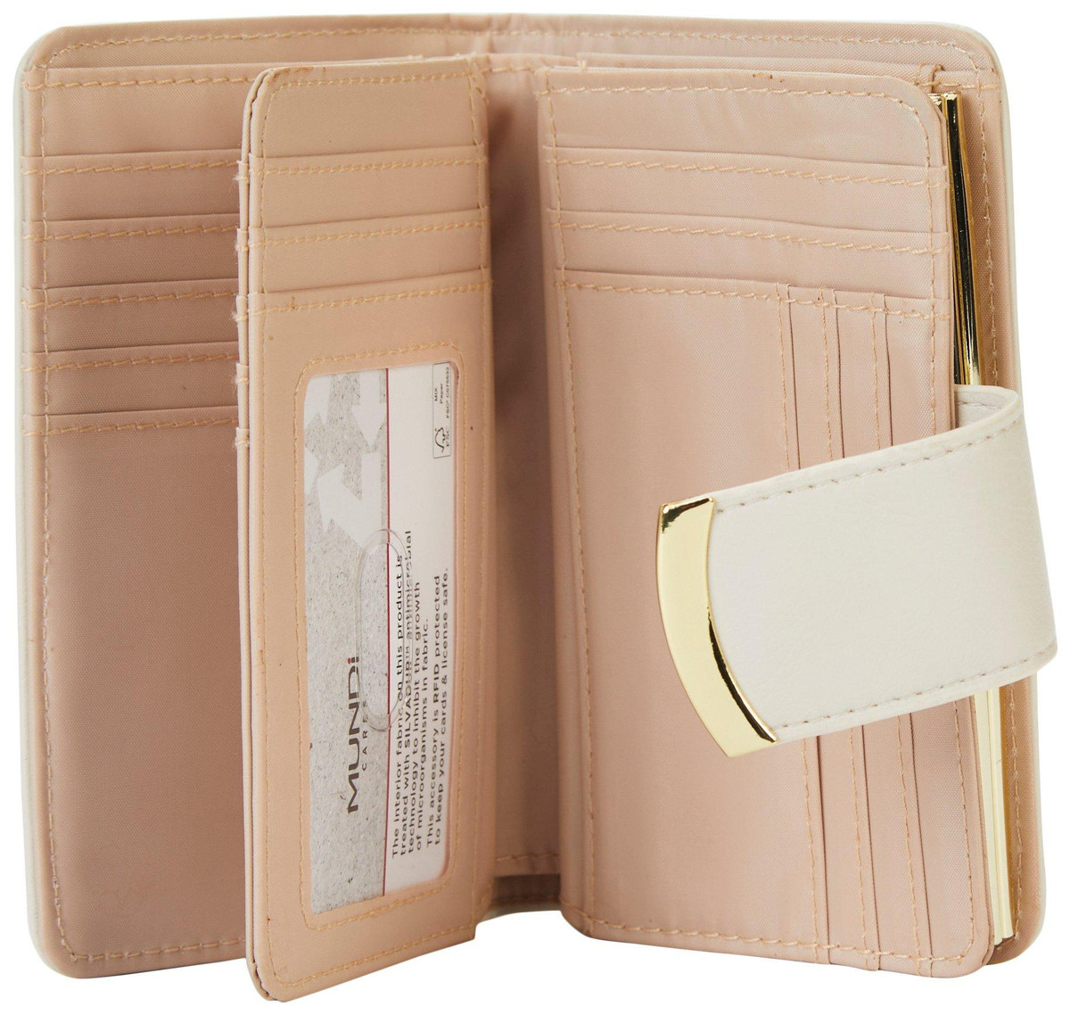 The Mundi S&P Indexer Wallet blends style and security with RFID-blocking tech, silver-tone hardware, and faux leather. It features 17 card slots, snap closure, 1 ID window, 1 bill pocket, 6 slip pockets, and 1 outside frame pocket. A sleek, organized wallet for everyday use. Measures 5.5 L x 4 H x 1 W