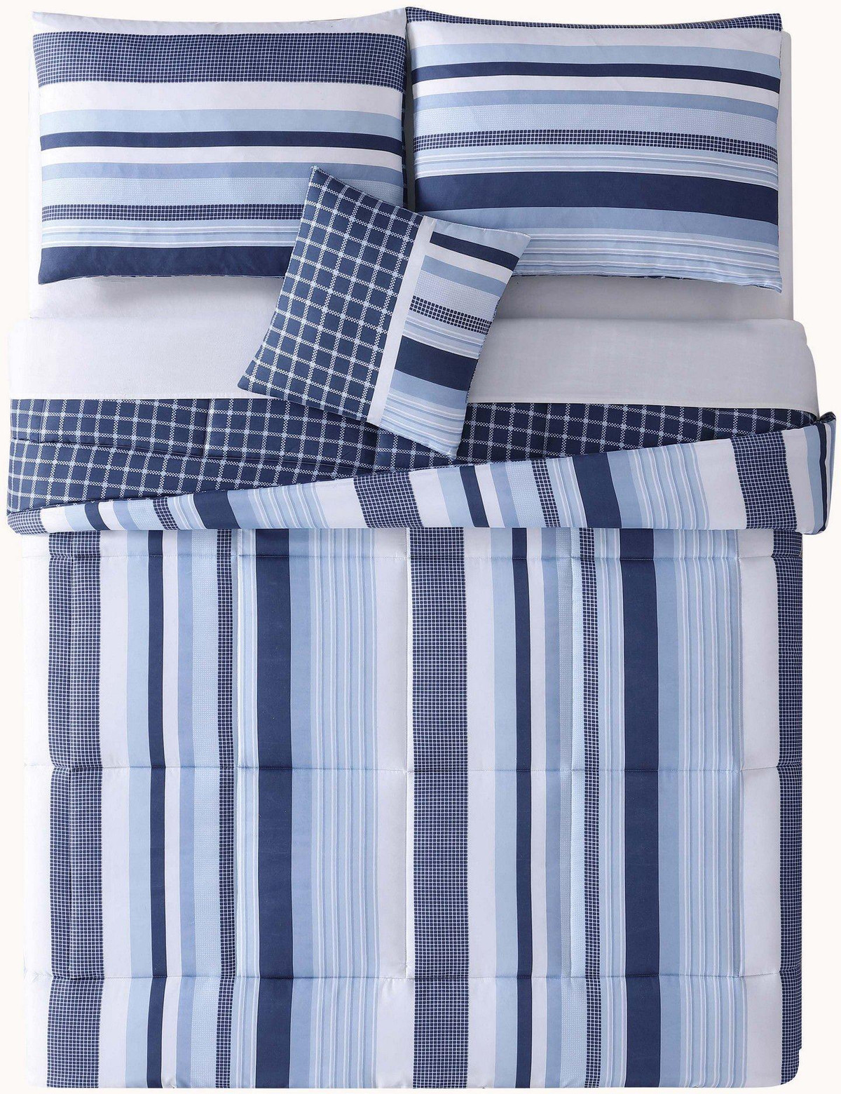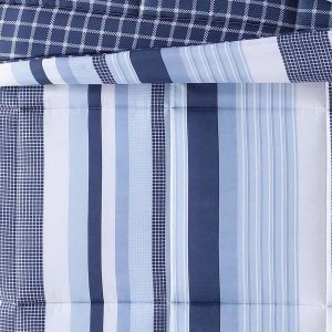Mason Stripe Comforter features a classic stripe print with plaid textures in blues and whites for a nautical theme. Reverse is blue grid print in same microfiber fabric. Set includes one comforter and two pillow shams (one twin), & 16” x 16” decorative pillow.