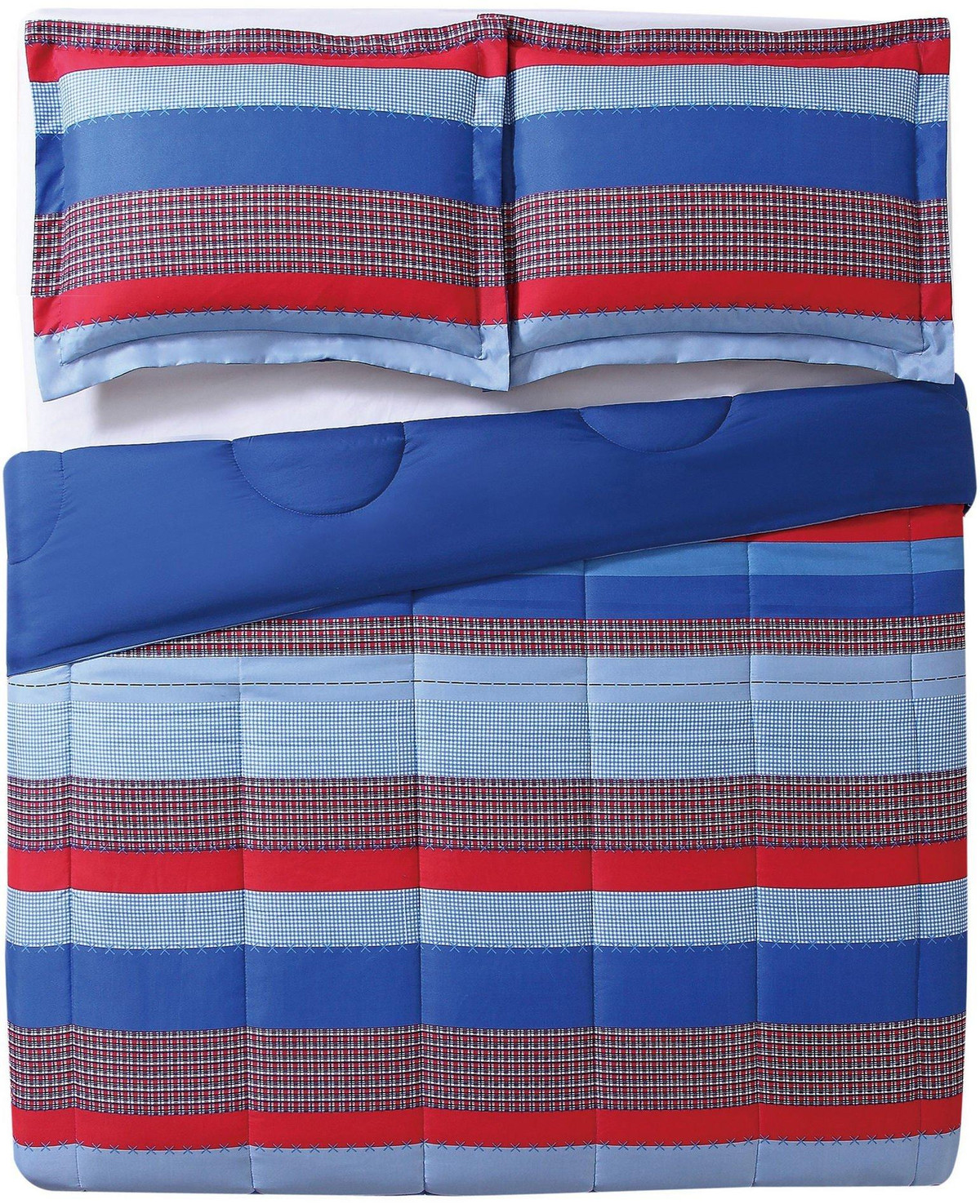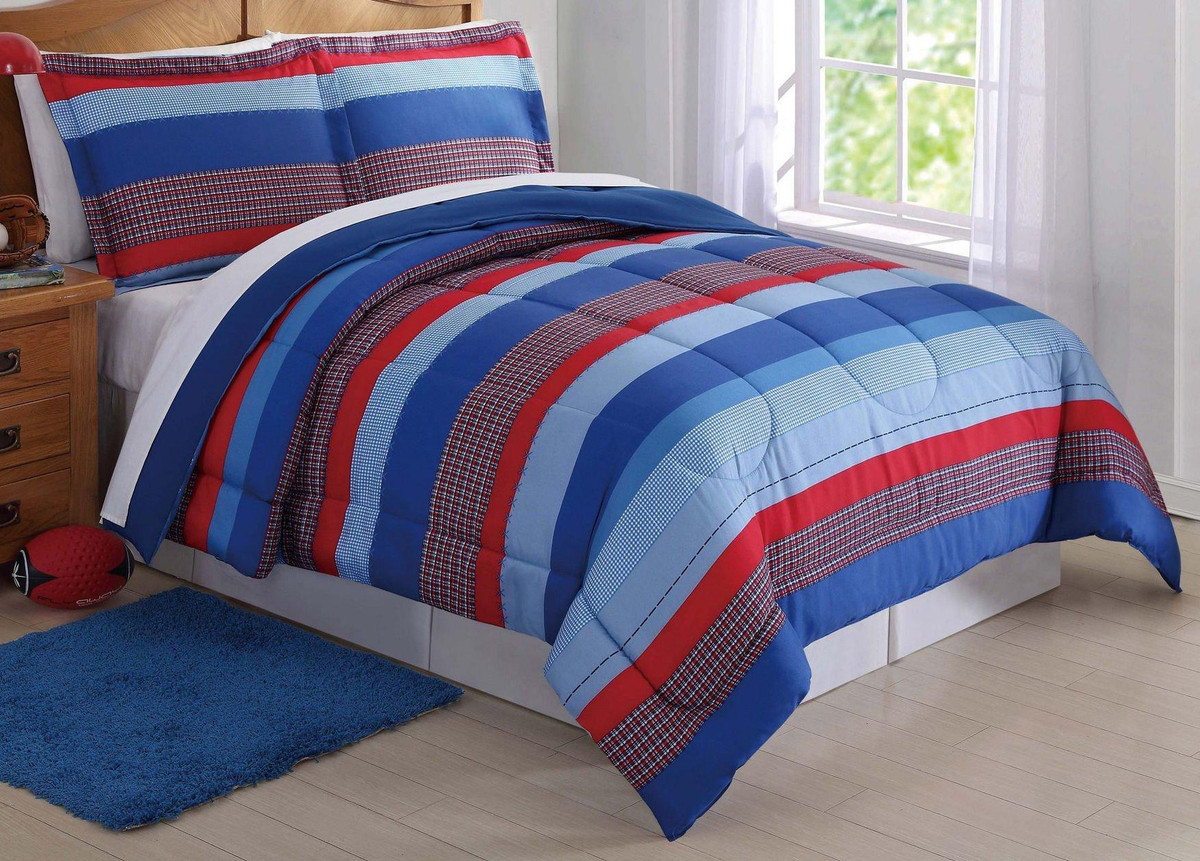 The Sebastian Stripe comforter by My World Kids features a patchwork stripe print in blues and reds. Set includes one comforter and two pillow shams (one twin).