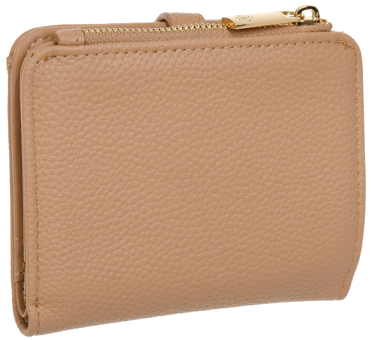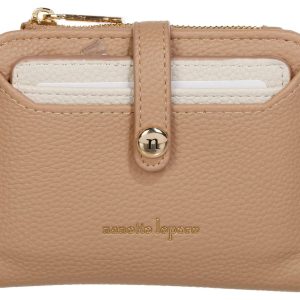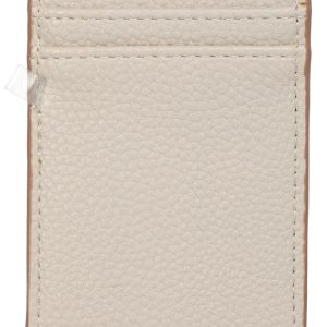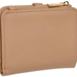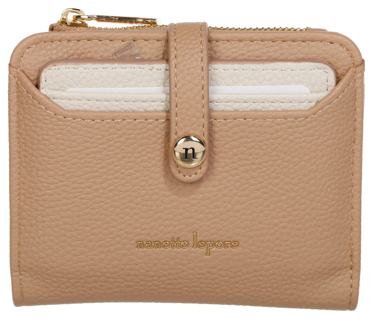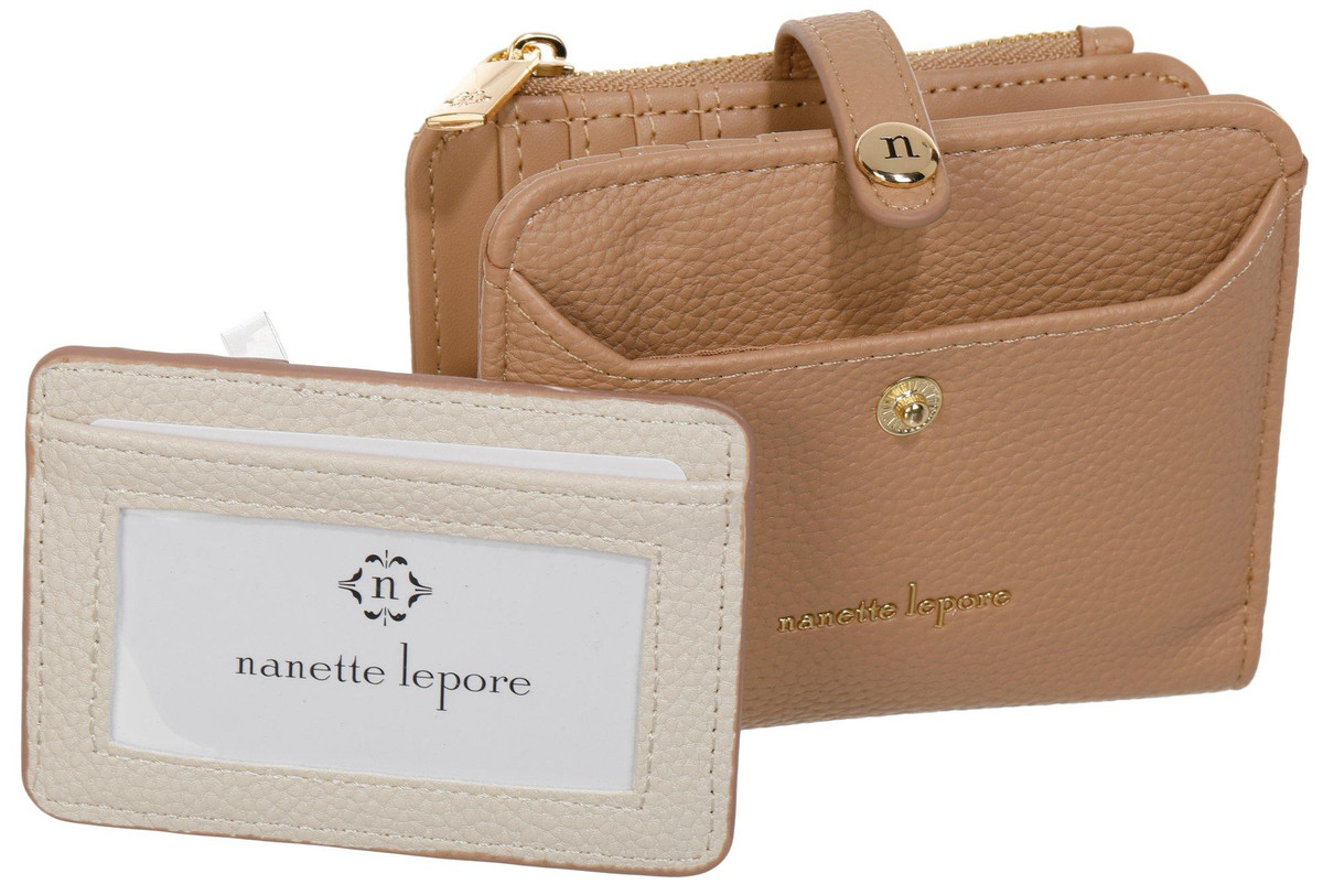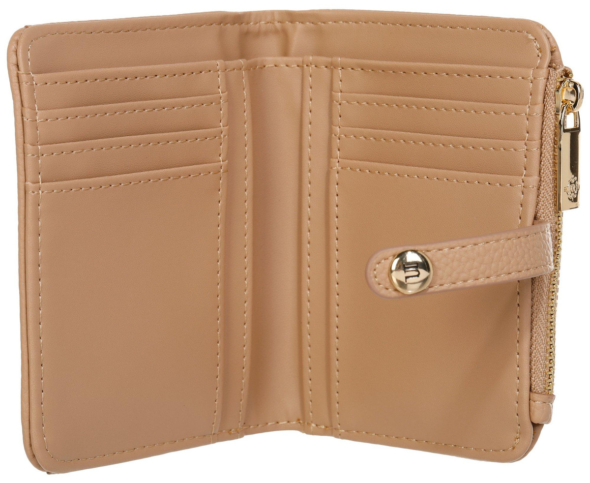 This Leza Bifold Wallet features a beautiful color design on a textured vegan leather, a rear zipper coin pocket, a front security strap snap pocket, and a flip open compartment with six card slots, four slip pockets, and a currency compartment. Bonus coordinating credit card and id case included. Measures approximately 5 in x 4 in.