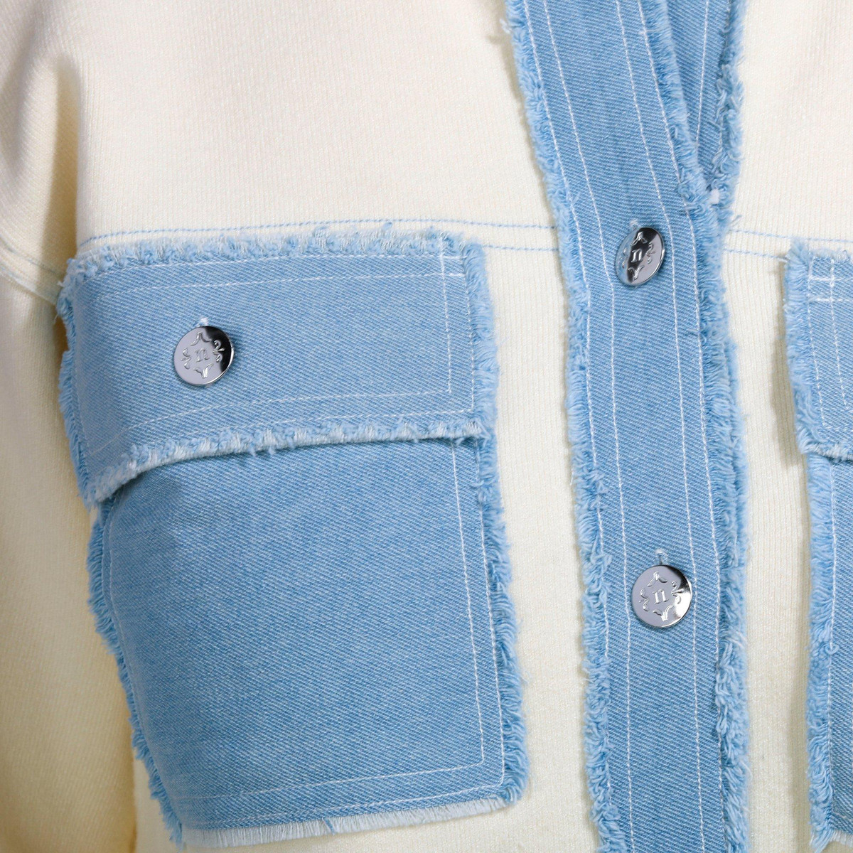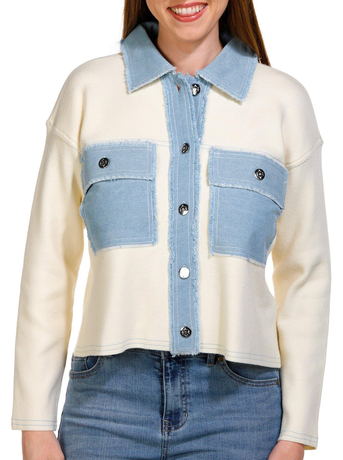 Introducing our Women’s Denim Trim Jacket, a chic blend of cotton, nylon, rayon, and polyester. This stylish jacket features a solid exterior with light wash denim trim, adding a trendy touch to your outfit. The button-down front, chest pockets, long sleeves, and collared neckline combine functionality with fashion. Perfect for layering, this jacket is a versatile addition to any wardrobe, offering both comfort and style for any occasion.