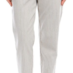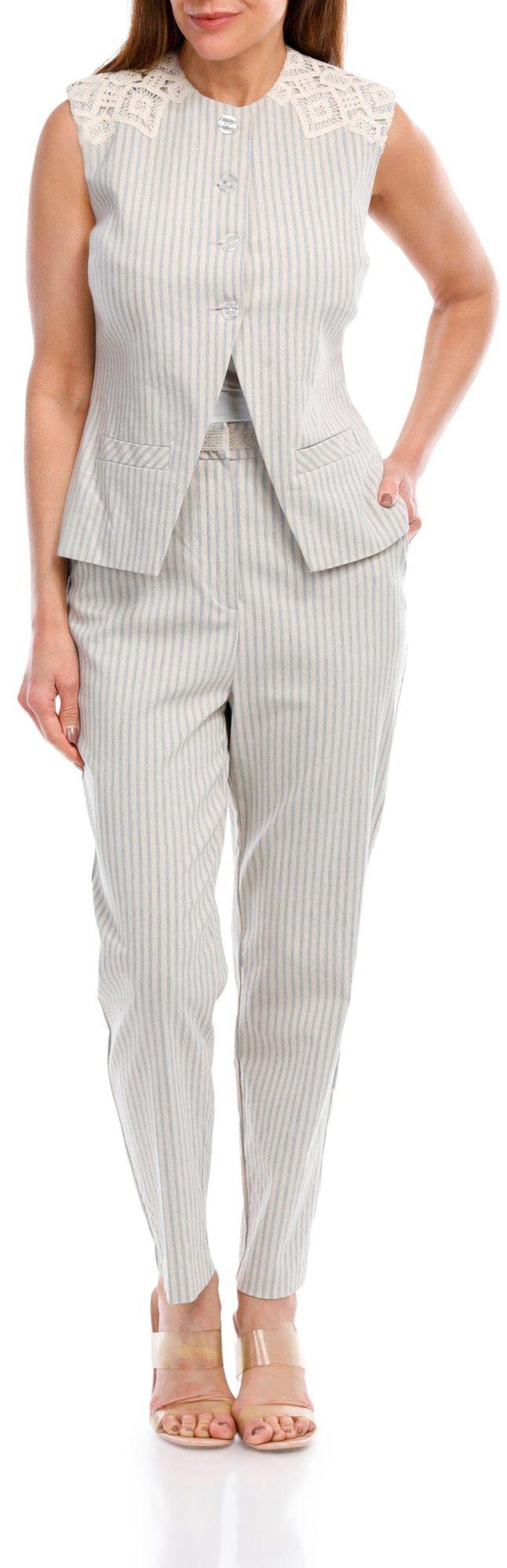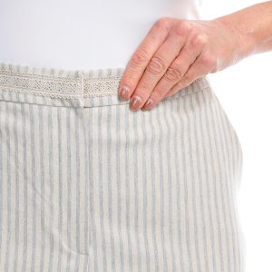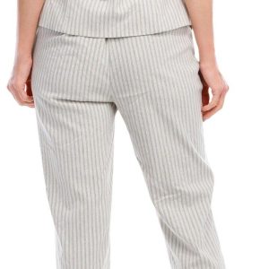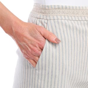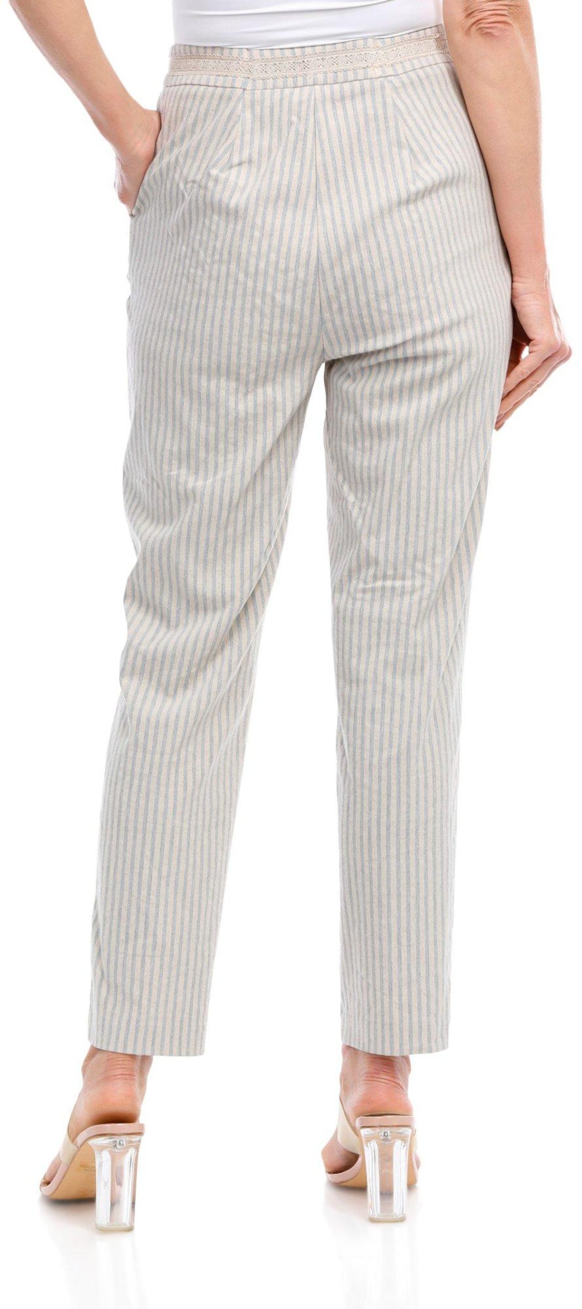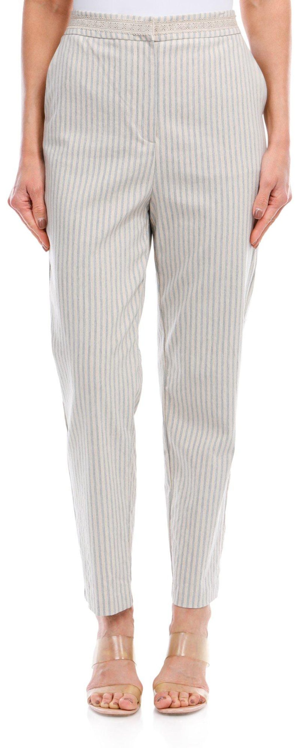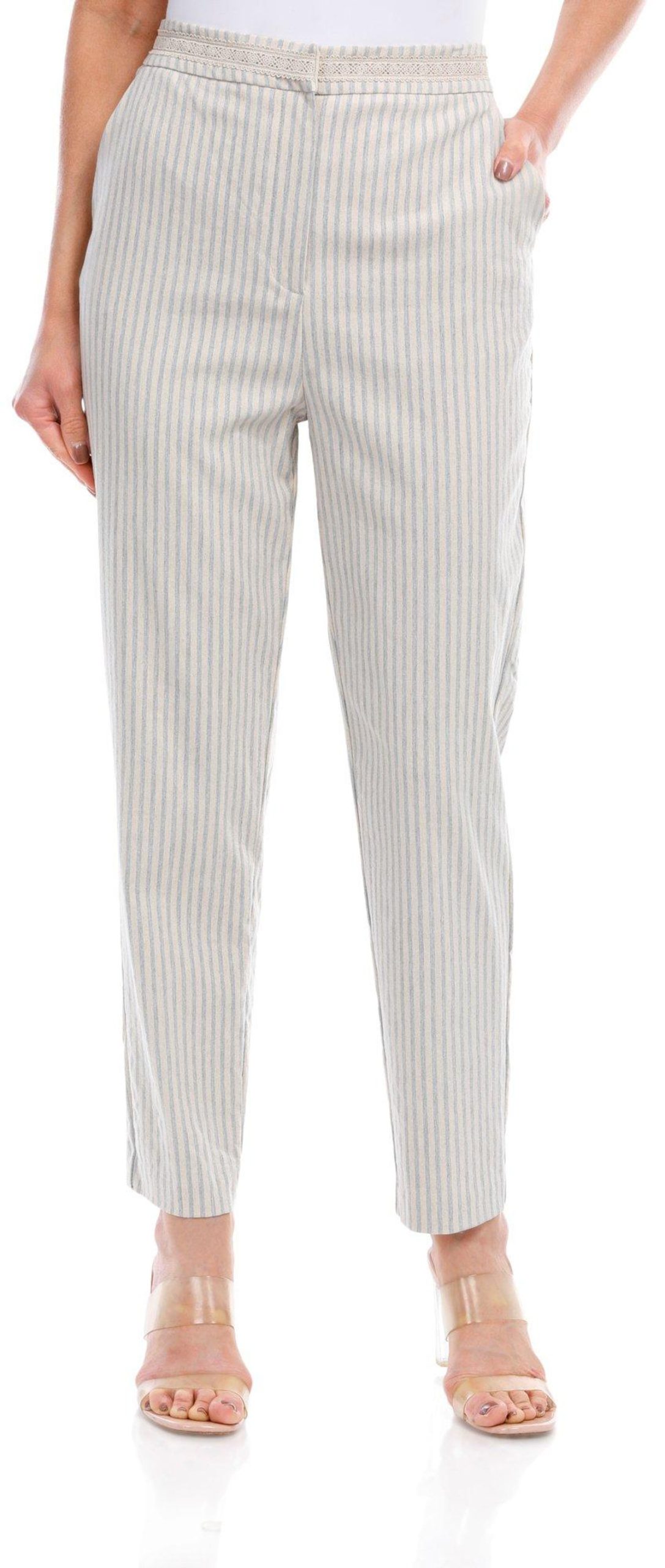 Easygoing and effortlessly chic, these pull-on pants feature elongating vertical stripes, delicate crochet waistband details, and handy side seam pockets. With a relaxed fit and lightweight feel, theyre perfect for sunny strolls, beach days, or casual lounging with a touch of boho flair. Fabrication is 64% rayon, 22% nylon, 11% linen, 3% spandex.