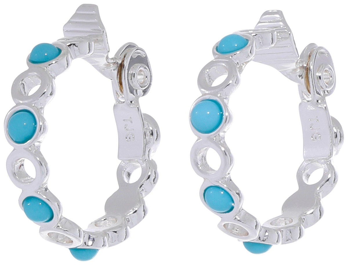 These stylish hoops feature a repeating pattern of silver-plated open circles accented with vibrant turquoise stones. Their bold yet versatile design makes them perfect for adding a pop of color to your everyday or vacation look.
